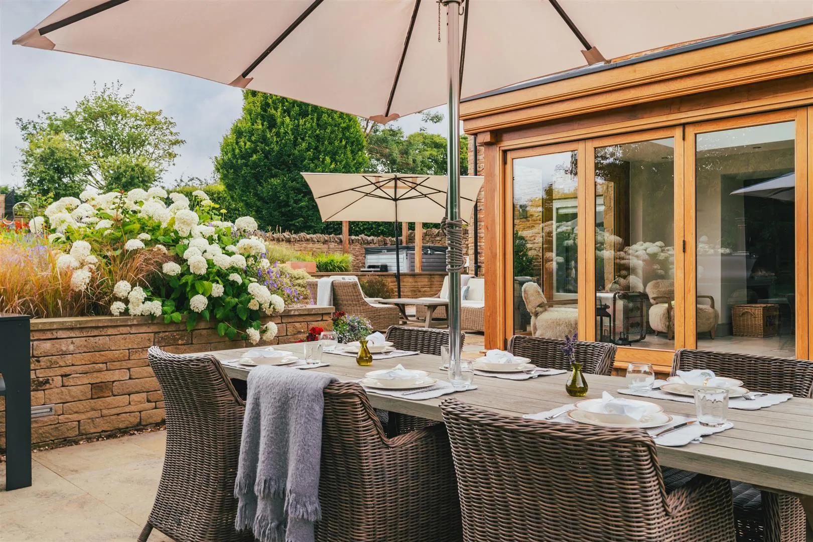 A light-filled orangery with a seamless transition to the outdoor seating terrace through two sets of oak bi-folding doors with double glazed panels. The orangery has an oak double glazed roof lantern with an opening window, recessed lighting, wall mounted light points and limestone tiled flooring with under floor heating.