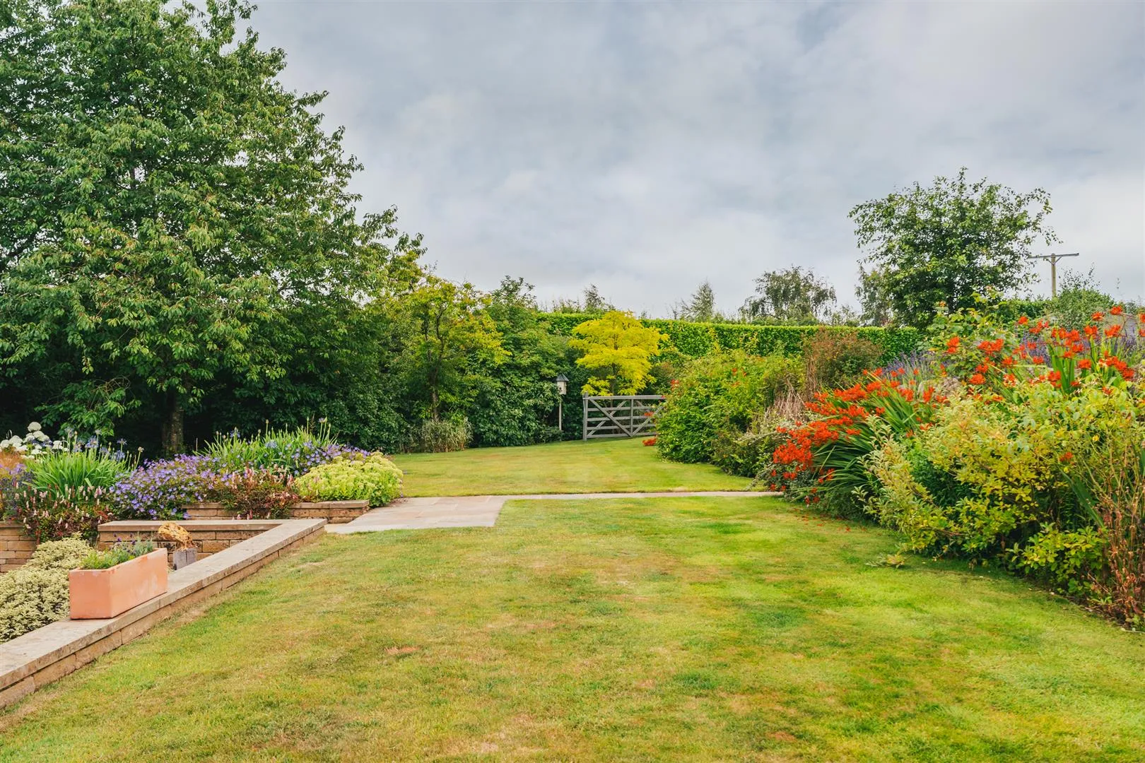 A stepping stone path leads across a lawned garden to the detached annexe. The garden is populated by an array of established trees, shrubs and flowers. Access is also gained by a timber pedestrian gate to the equestrian facilities and also to a storage/composting area behind the triple garage.