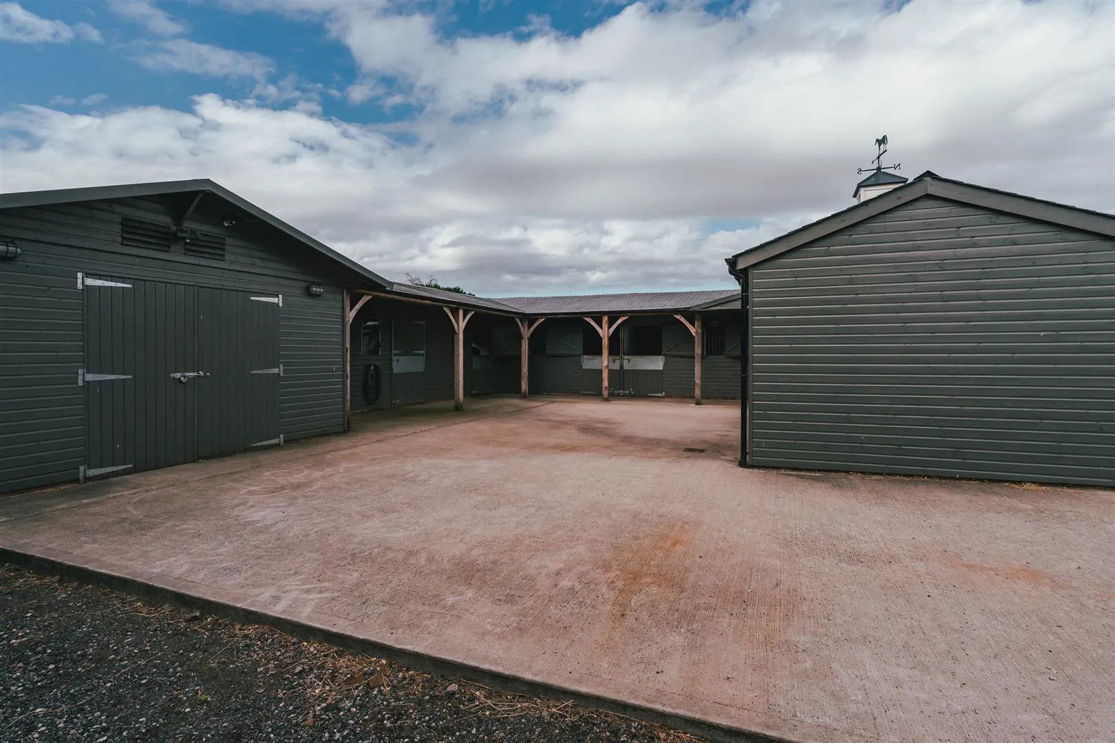 From the private lane, an oak gate opens to a hardstanding, which provides access to the stable block, wash bay and Olympic-sized manège. Externally, the stable block has exterior lighting, a water tap and an external power point. The equestrian facilities and paddocks extend to approximately 8.5 acres.