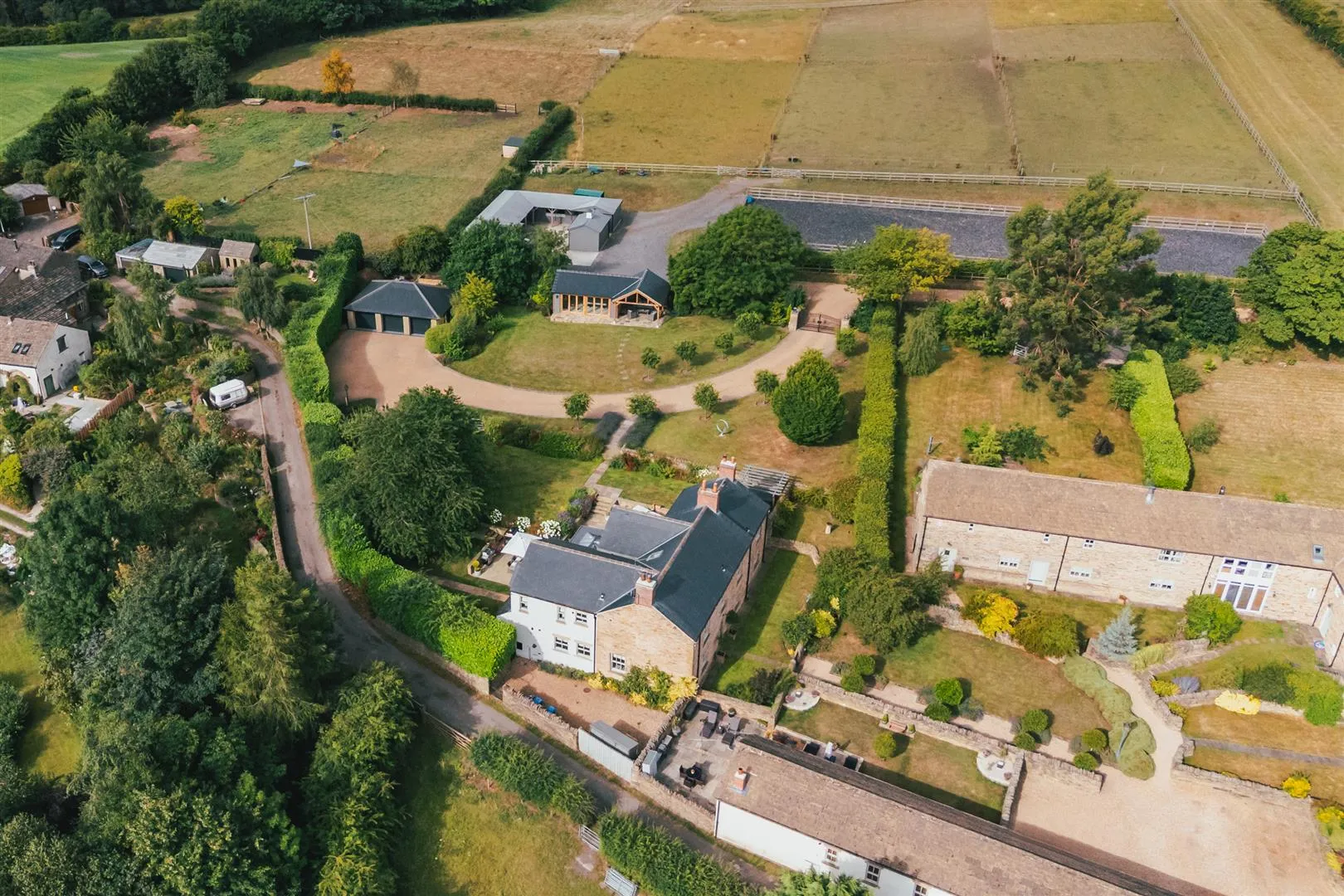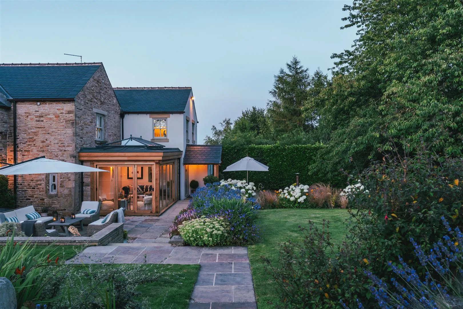 The stone flagged seating terrace provides extensive space for comfortable seating and has exterior lighting. Access can be gained to the lounge, orangery and primary entrance door, which is set beneath an oak framed canopy with exterior lighting. A stone flagged path meanders between trees and leads to a timber pedestrian gate opening to the gravelled parking area.