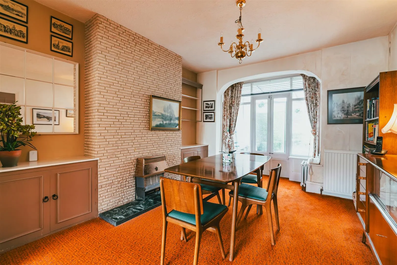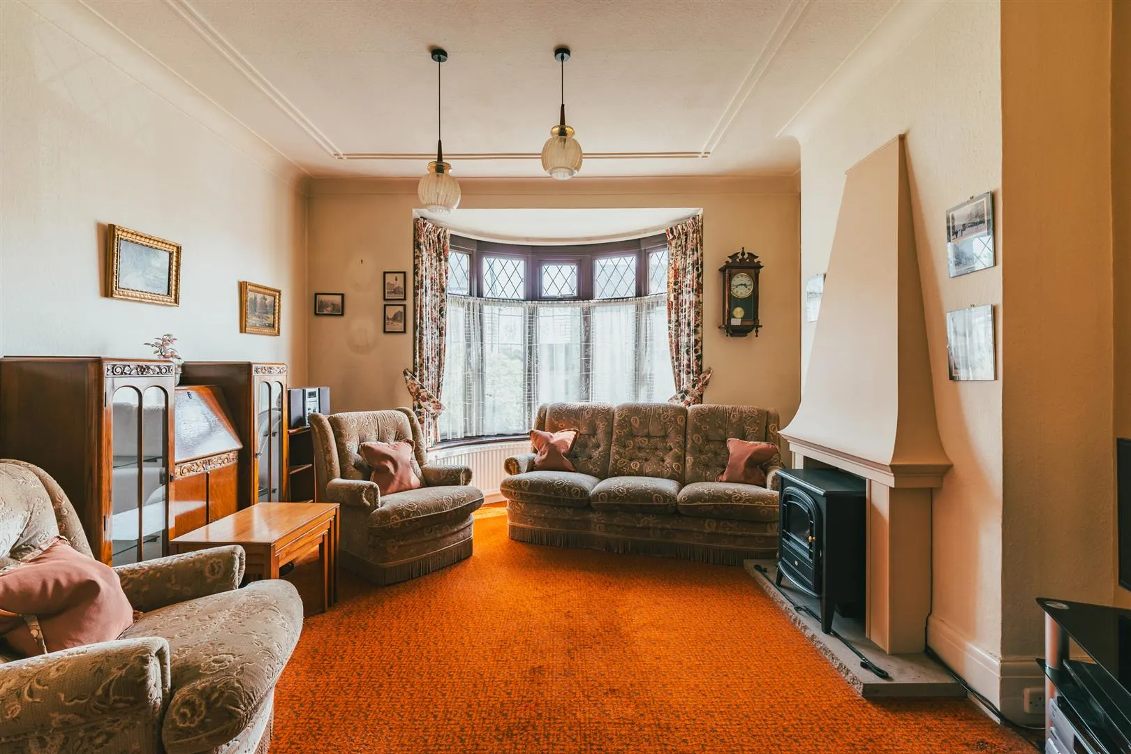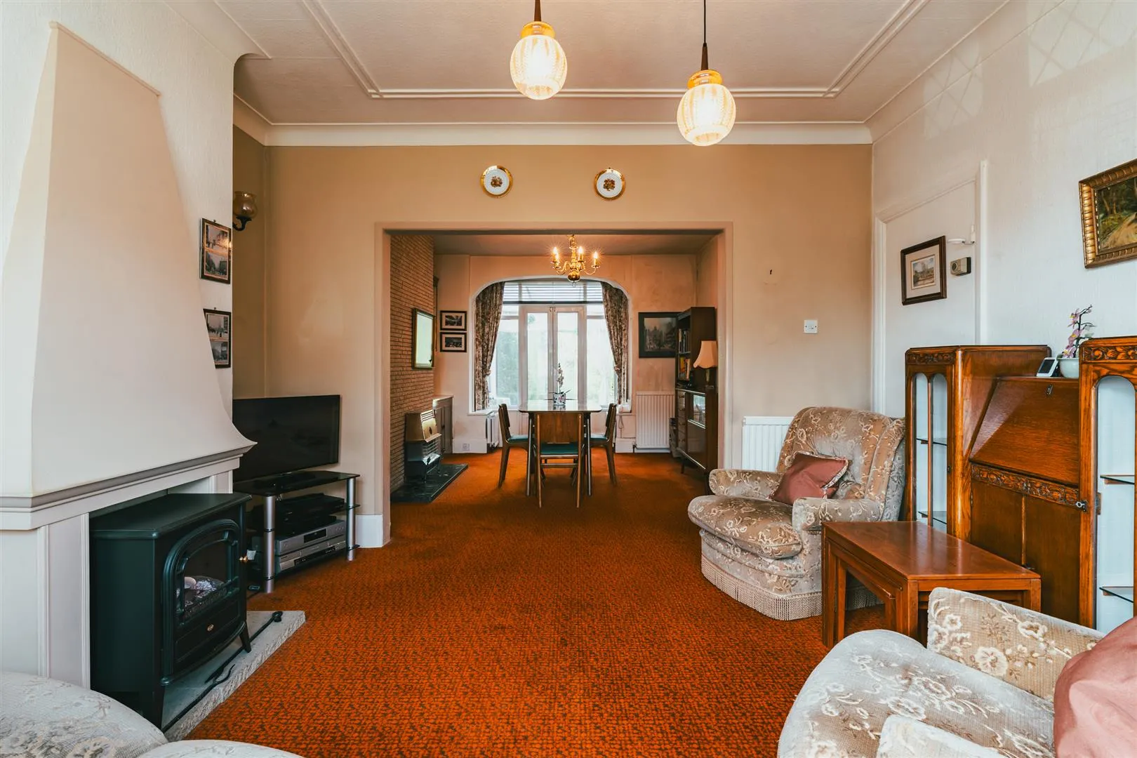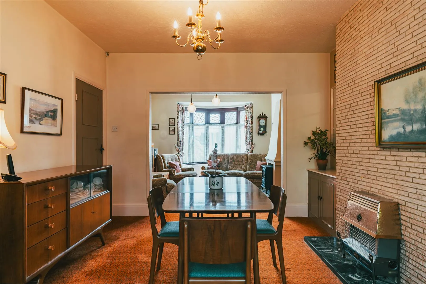 A sizeable lounge with a front facing UPVC timber effect double glazed bow window, coved ceiling, pendant light points, central heating radiators, satellite point and deep skirtings. The focal point of the room is the electric fire with a timber surround and stone hearth. A large opening gives access to the dining room.