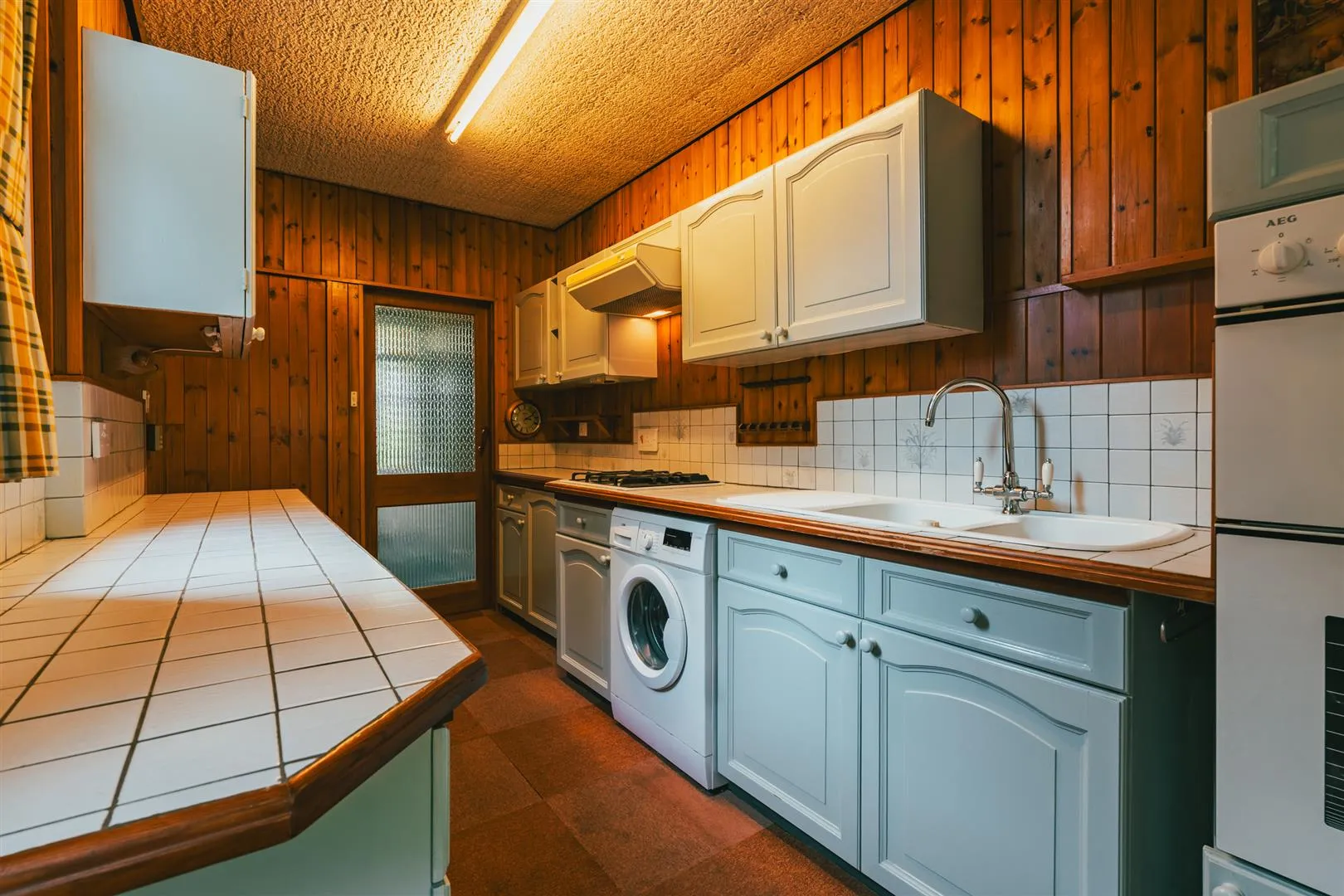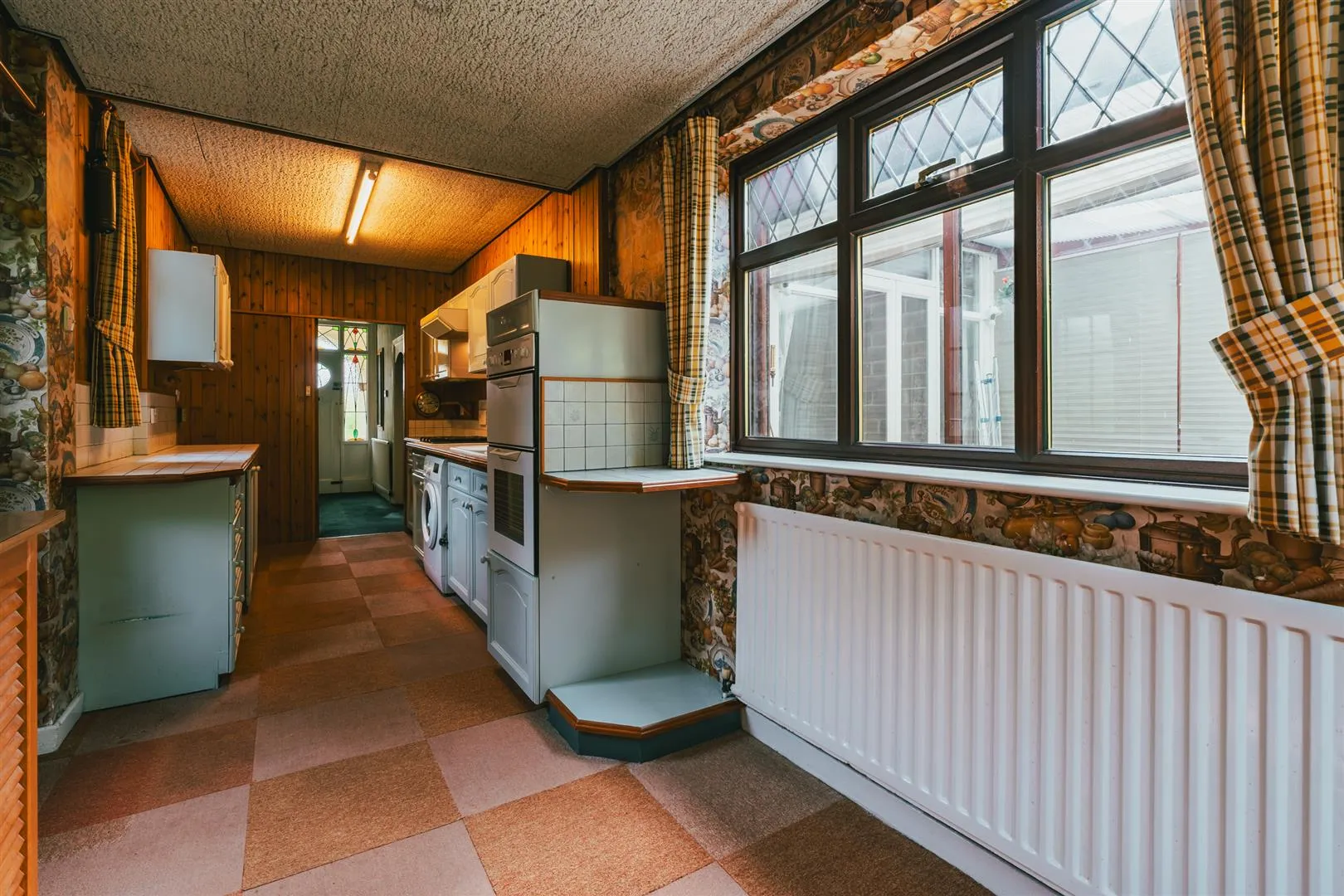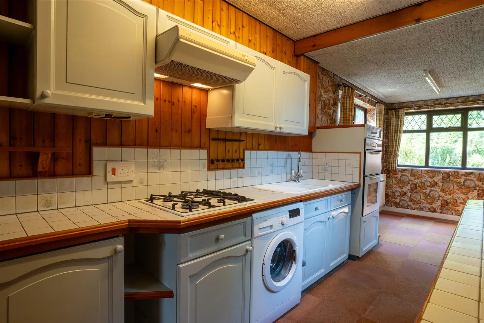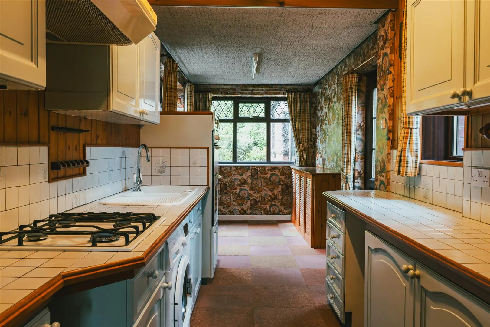 Being well-appointed and having side and rear facing UPVC timber effect double glazed windows, strip lighting and a central heating radiator. There are a range of fitted base/wall and drawer units incorporating a tiled work surface, matching splash back and an inset 2.0 bowl sink with a chrome mixer tap. Appliances include a four-ring gas hob, extractor fan and an AEG oven. A cupboard houses the boiler. A UPVC timber effect door with a double glazed obscured panel opens to the right side of the property.
