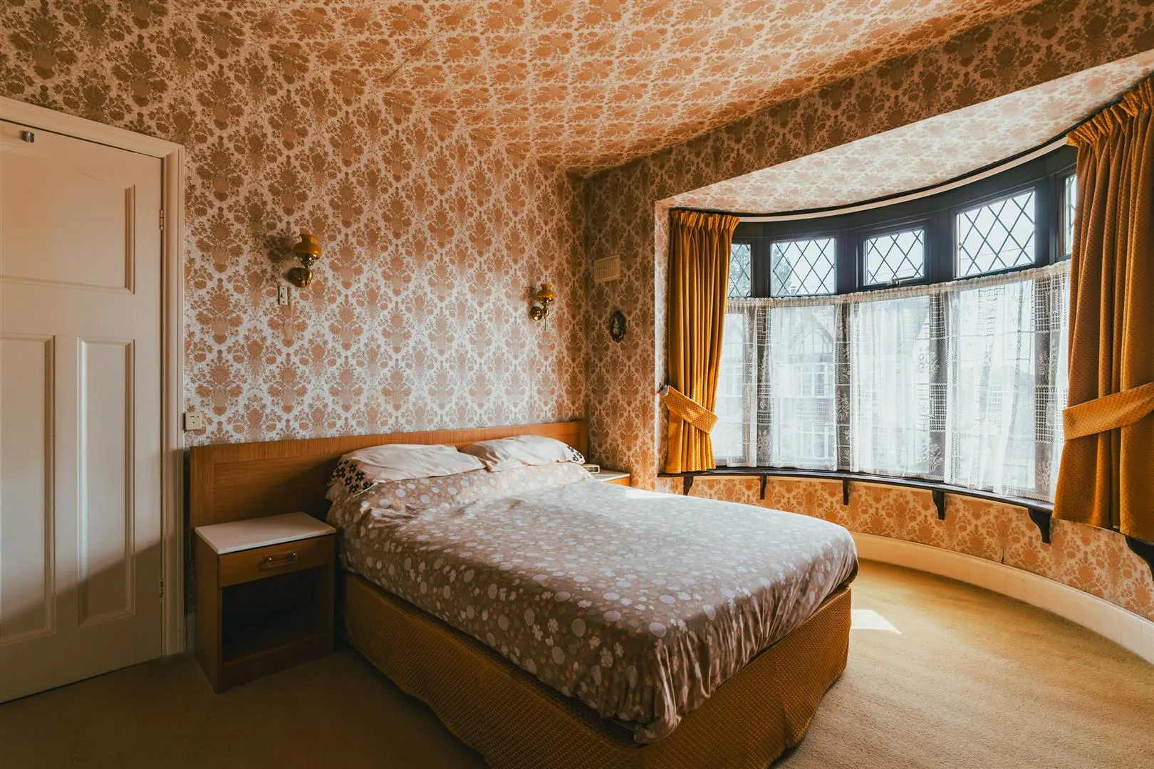 A double bedroom with a front facing UPVC timber effect double glazed bow window, pendant light point and a central heating radiator. Fitted furniture includes long hanging, short hanging and shelving.