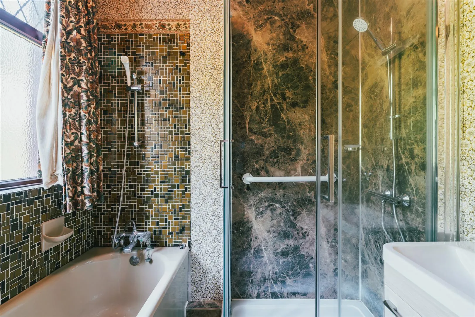 Having a rear facing UPVC timber effect double glazed obscured window, a flush light point and a central heating radiator. There is a panelled bath with a chrome mixer tap and an additional hand shower facility and to one corner is a separate shower enclosure with a fitted shower and a glazed screen/door. There is a wash hand basin with a chrome mixer tap and storage beneath, together with fitted furniture, including shelving.