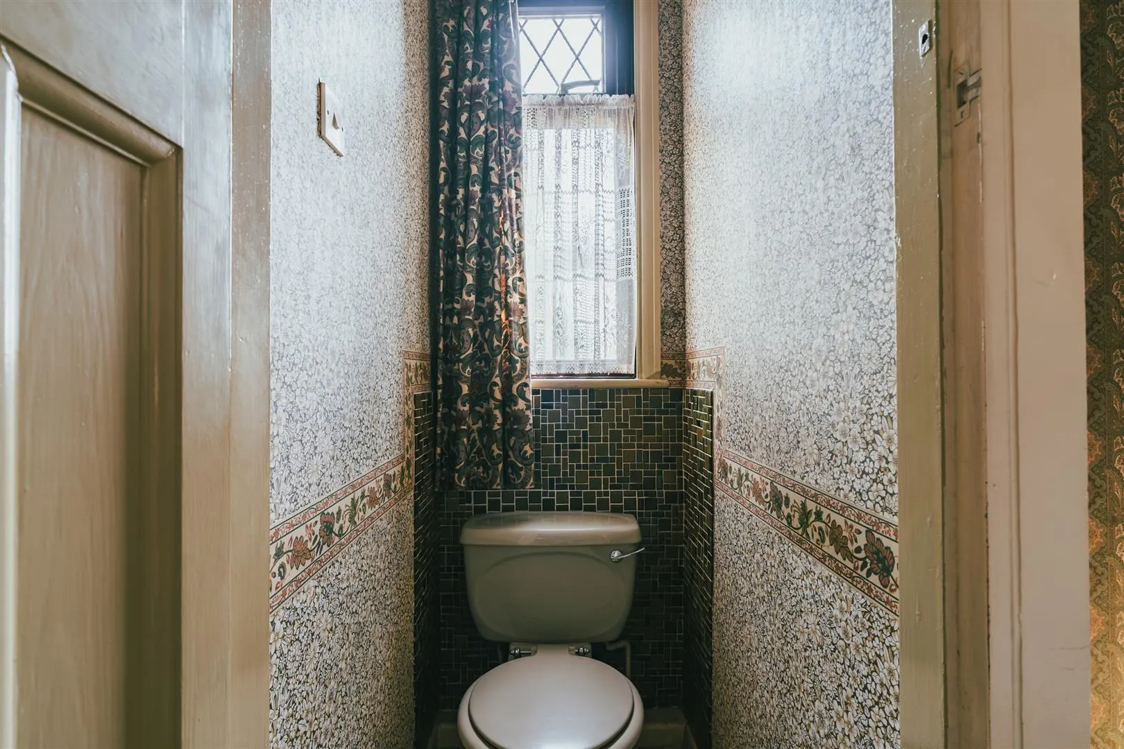 Having a side facing UPVC timber effect double glazed obscured window, pendant light point and partially tiled walls. There is a suite with a low-level WC and a wall-mounted wash hand basin with a chrome tap.