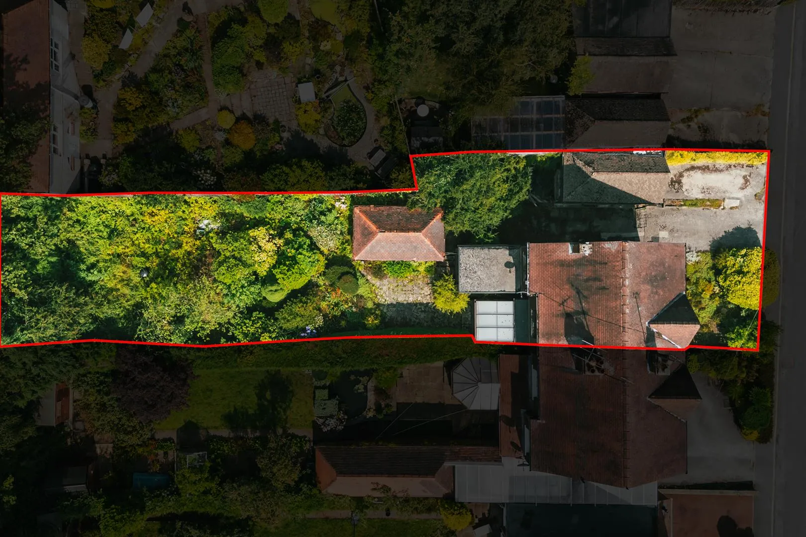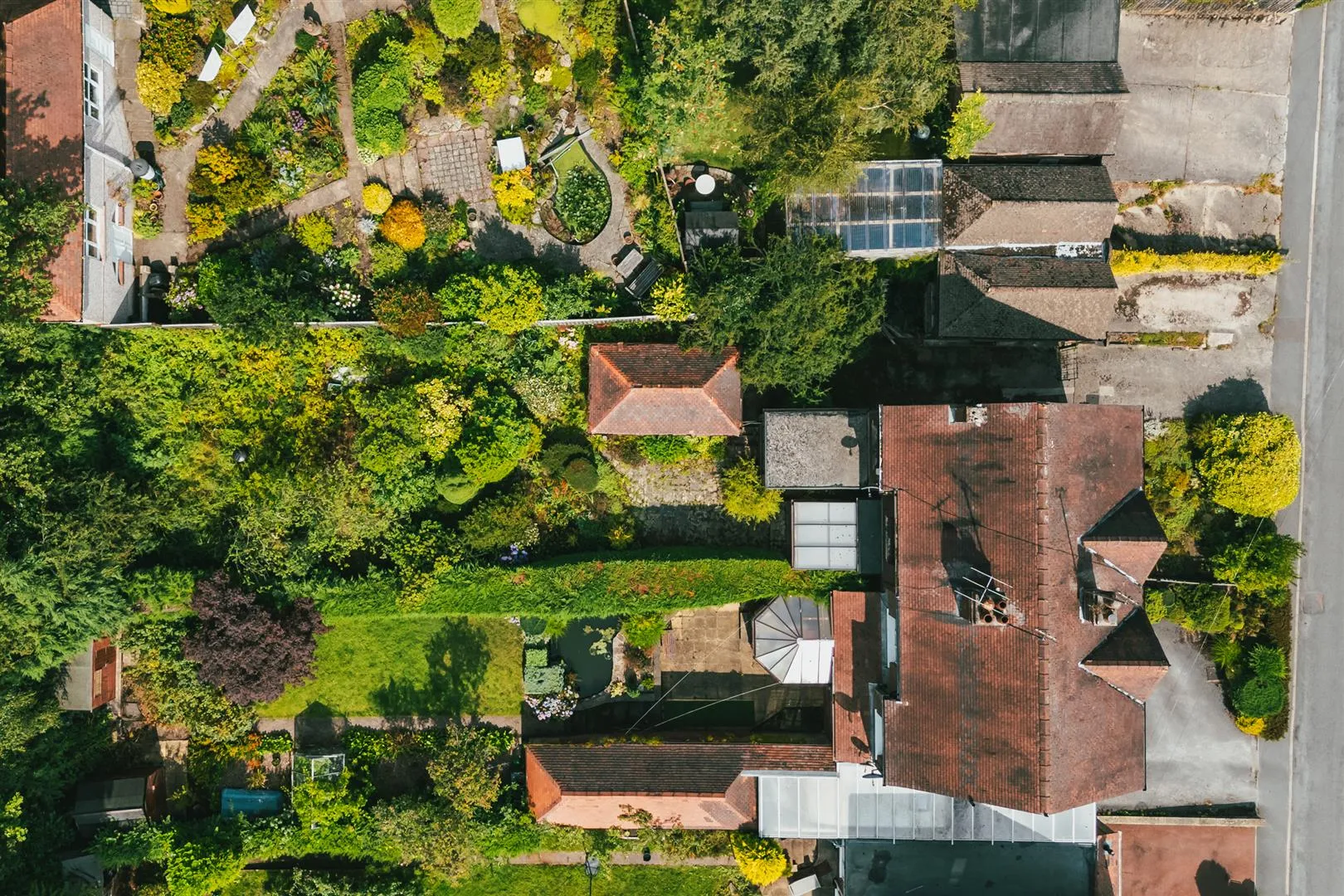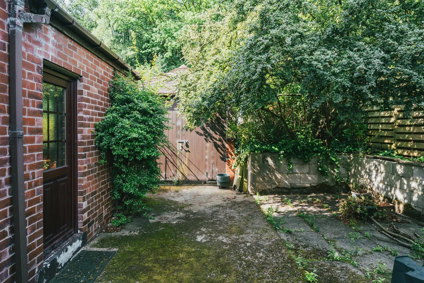 A wrought iron gate opens to the right hand side of the property. To the right hand side of the property, there is a large patio, mature plants and a mature tree. At the end of the driveway, a timber door opens to the detached garden store and a wrought iron gate opens to the rear garden. Access can be gained to the dining kitchen.