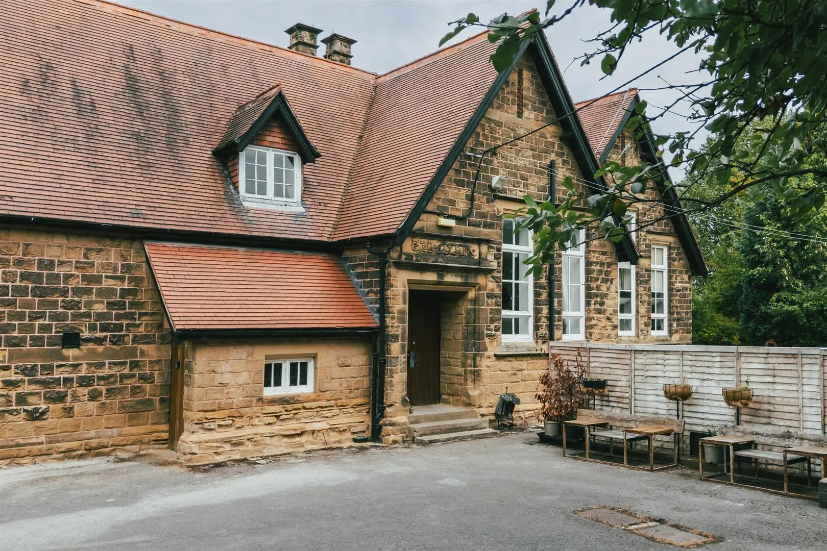 To the front, is a part cobbled and part tarmacked driveway that provides extensive parking for several vehicles. There is exterior lighting, an external power point and raised sleeper borders to one side. Access can be gained to the entrance porch where there is an exterior light and the main entrance door with a stone lintel above with the carved word ‘boys’ from when the building was a school. Access can also be gained to a door, which opens to the basement level. To the right side of the building, an external door opens to the inner hallway.
