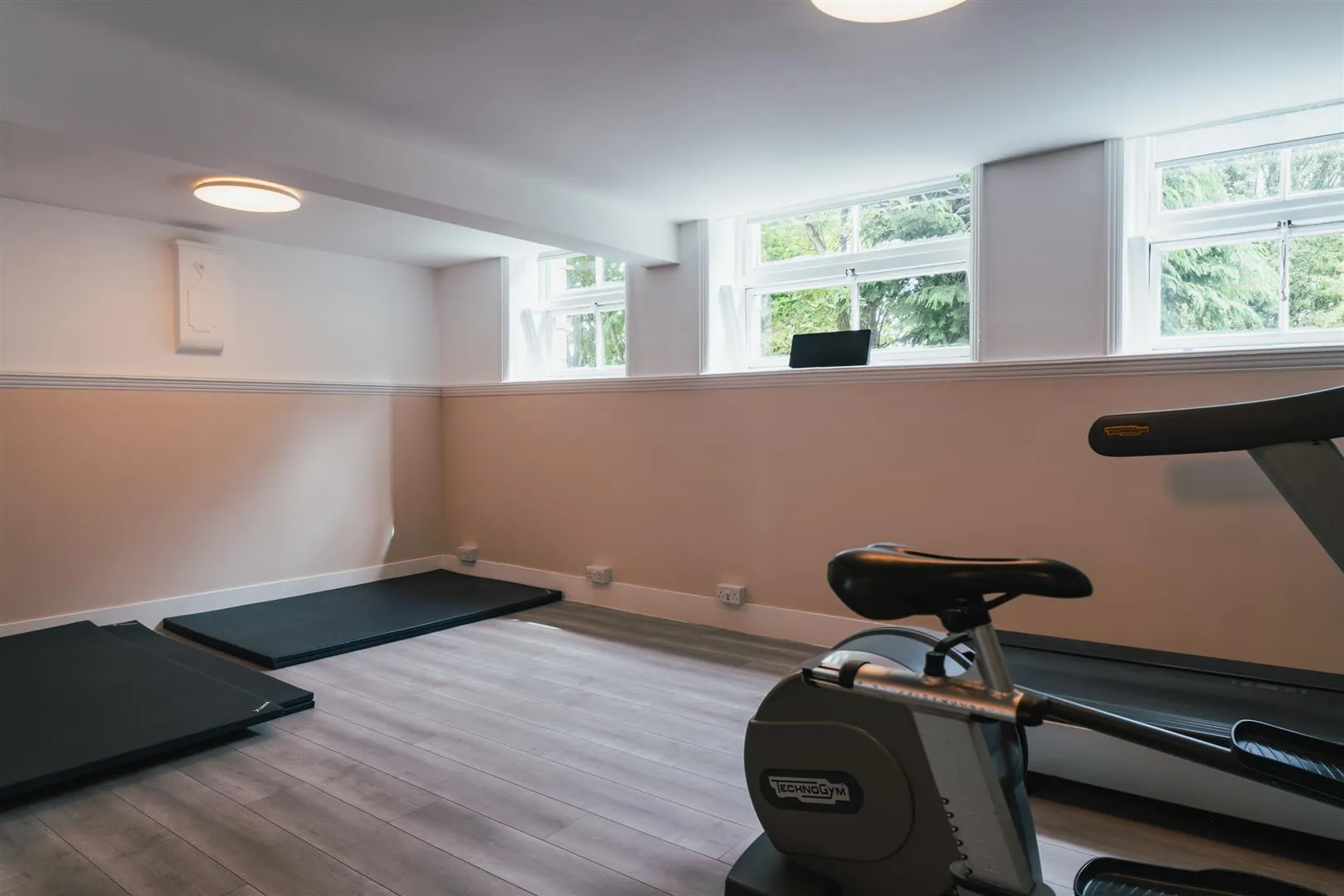 A sizeable space, currently utilised as a gymnasium. Having side facing timber glazed windows, flush light points, TV/aerial points and timber effect flooring. Double timber doors open to the store and lounge/dining room.