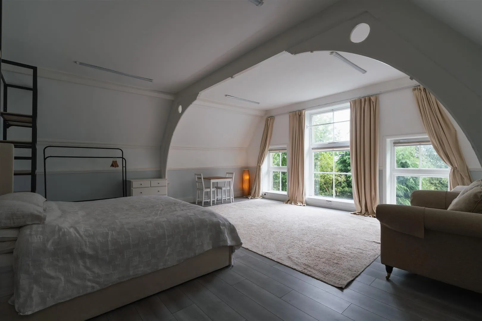 A large master bedroom sat beneath a vaulted ceiling with an exposed timber truss. Having a side facing timber glazed window, side facing timber glazed panels, strip led lighting, dado rail and timber effect flooring with under floor heating.