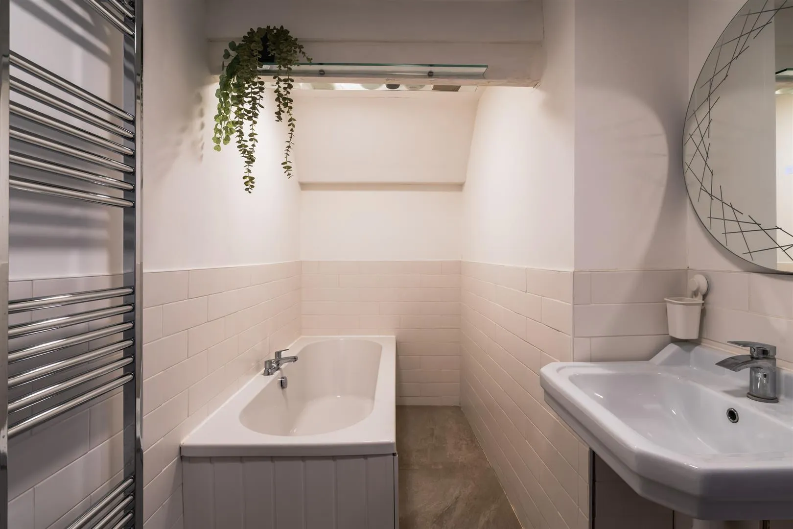 Having flush light points, chrome heated towel rail, illuminated vanity mirror, partially tiled walls and tiled flooring. A suite in white comprises a low-level WC and a wall mounted wash hand basin with a chrome mixer tap. To one corner, is a panelled bath with a chrome mixer tap.