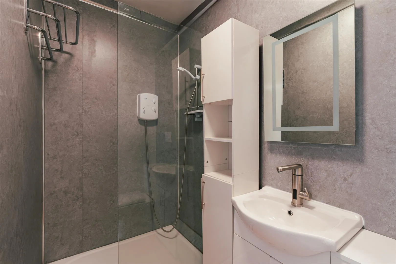 Having a flush light point, extractor fan, illuminated vanity mirror and timber effect flooring with under floor heating. A suite in white comprises a low-level WC and a wash hand basin with an automatically operated chrome mixer tap and storage beneath. To one wall, is a shower enclosure with a fitted Triton shower and a glazed screen.