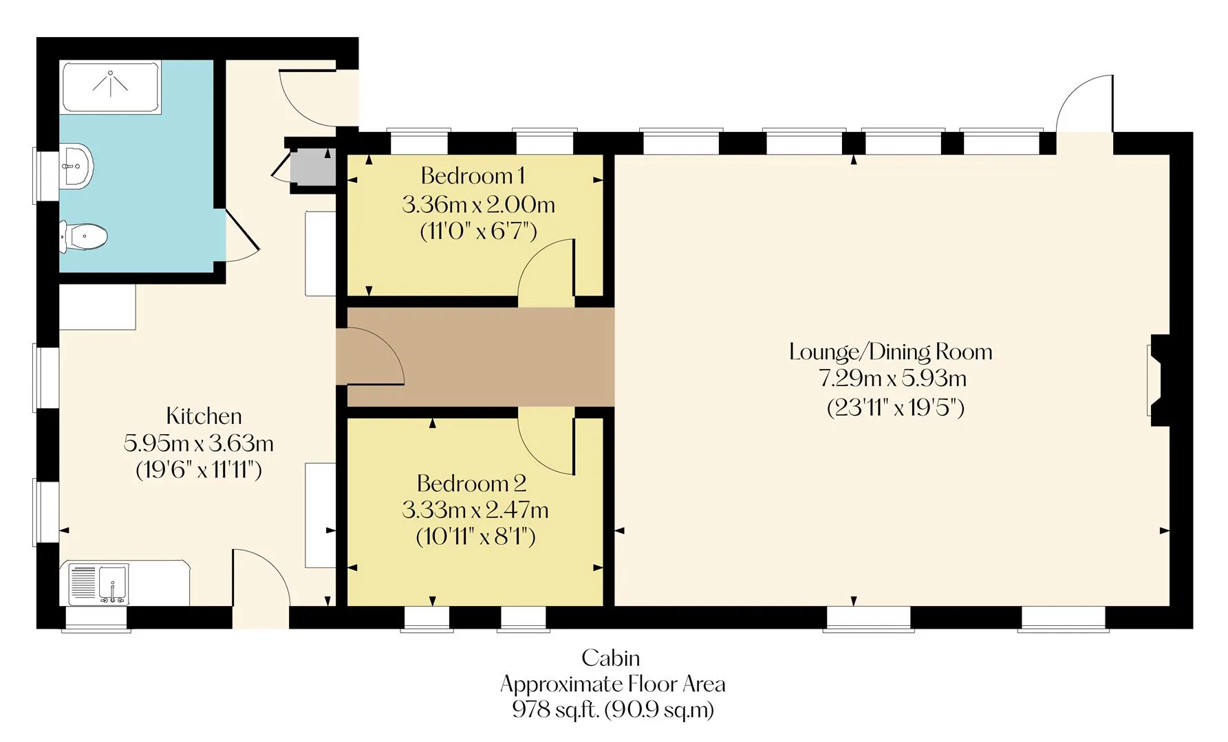 Cabin: Kitchen, shower room, lounge/dining room, bedroom 1 and bedroom 2.