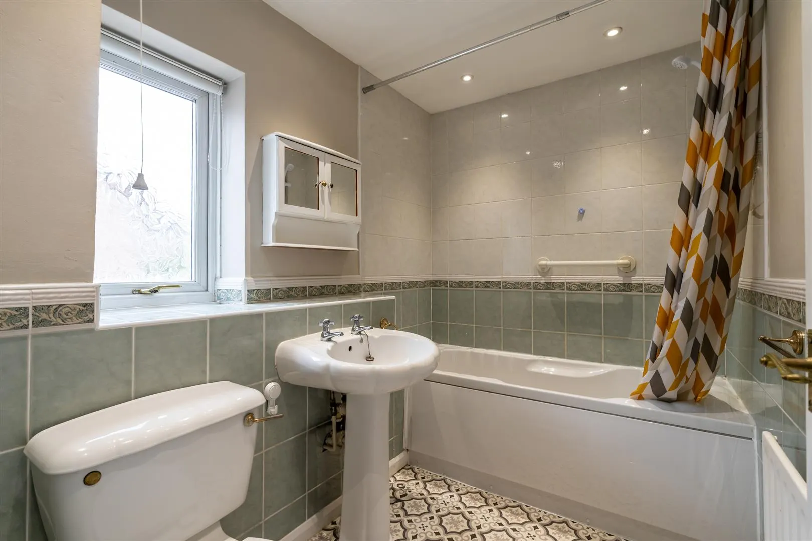 Having a side facing UPVC double glazed obscured window, recessed lighting, partially tiled walls, and a central heating radiator. A suite in white comprises a low-level WC and a pedestal wash hand basin with a chrome mixer tap. There is a panelled bath with traditional chrome taps, a fitted shower unit and a curtain rail.