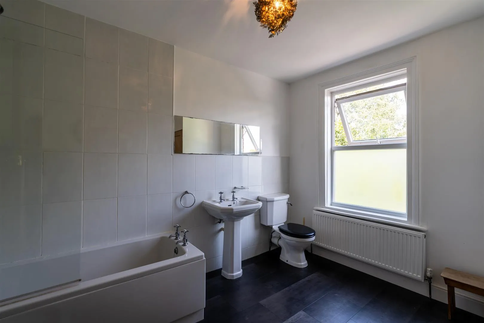 Having a rear facing UPVC double glazed window, pendant light point, central heating radiator and a chrome heated towel rail. A suite in white comprises a low-level WC and a pedestal wash hand basin with traditional chrome taps. There is a panelled bath with traditional chrome taps, a fitted shower, an additional hand shower facility and a glazed screen. A cupboard houses the Vaillant boiler.