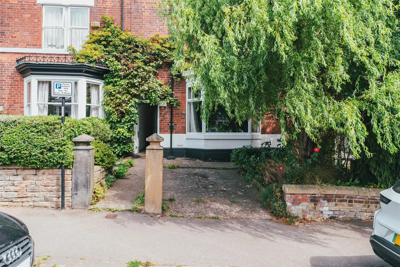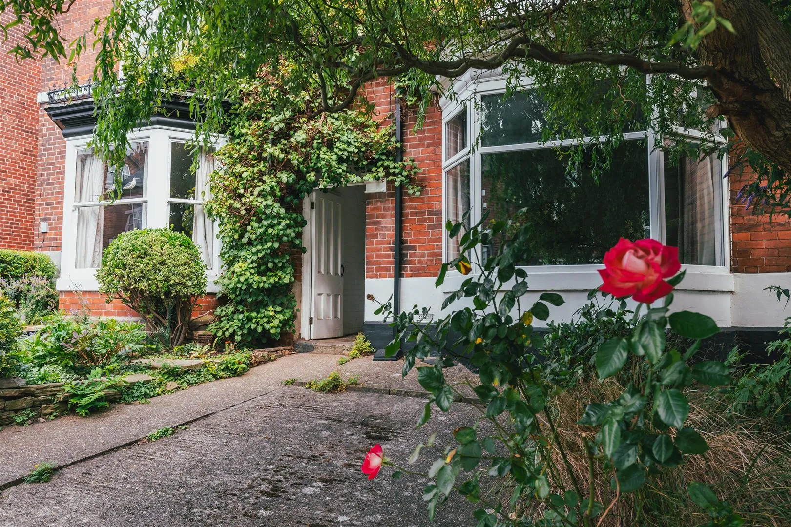 To the front of the property is a driveway with parking for one vehicle and mature trees and shrubs. A path leads to a timber door which opens to a shared alleyway.