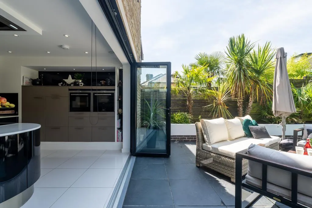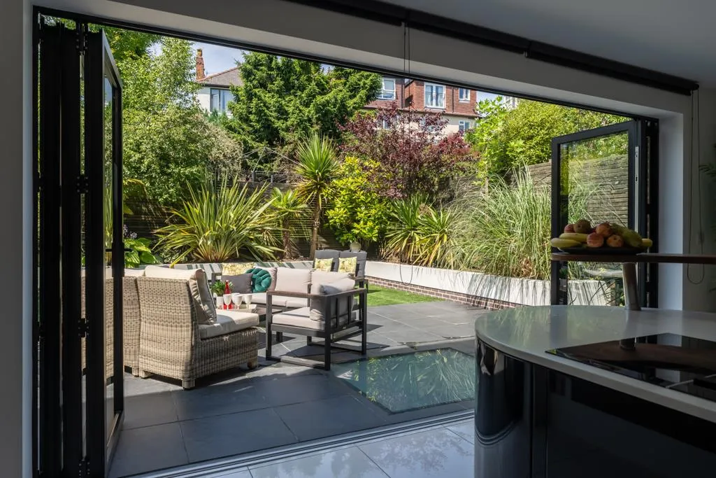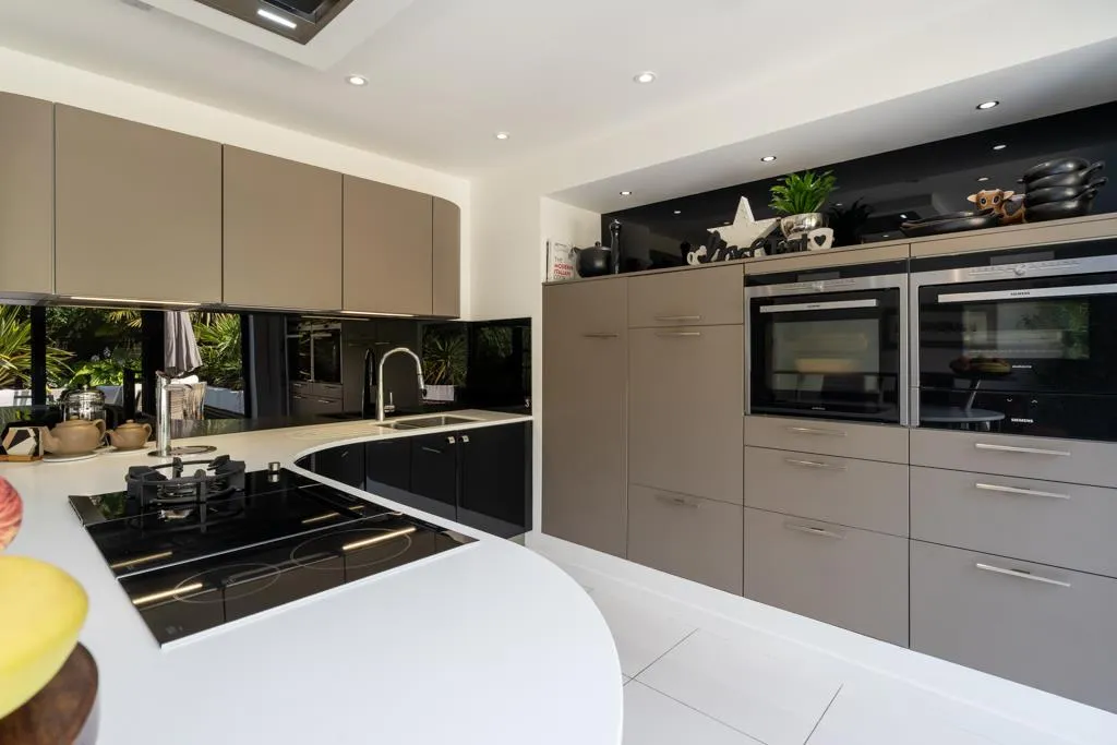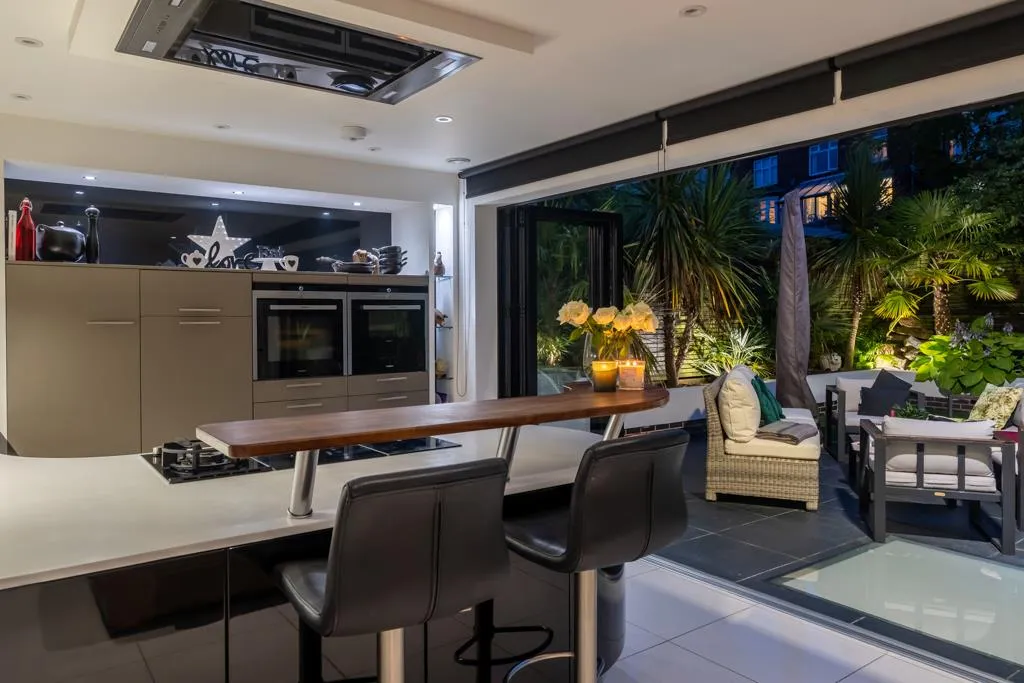 A contemporary breakfast kitchen that seamlessly transitions into the rear garden. Having recessed lighting, air distribution vents, TV/aerial point, data points and tiled flooring with under floor heating. There is a range of fitted base/wall and drawer units, incorporating a matching work surface, glazed shelving, glazed splash backs and under-counter lighting. Inset into the work surface is a 1.5 bowl Franke stainless steel sink with a Franke extendable chrome mixer tap. There is also a separate Zip Hydrotap providing boiling and chilled water. A raised oak work surface provides breakfast seating. The appliances are by Siemens and include a two-ring induction hob, teppanyaki plate, wok burner, concealed extractor fan, fan assisted oven, steam oven, warming drawer, dishwasher and a fridge/freezer. Dual bi-folding aluminium doors with double glazed panels open to the rear of the property.
