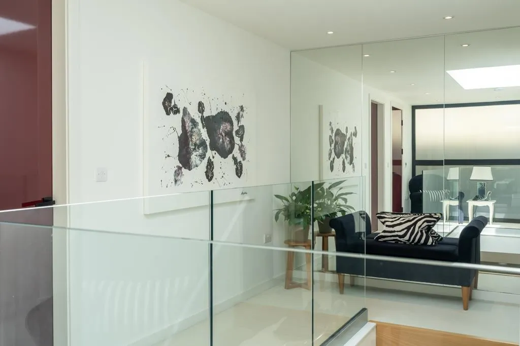 From the first floor landing, an oak staircase with a metal hand rail and glazed balustrading rises to the: