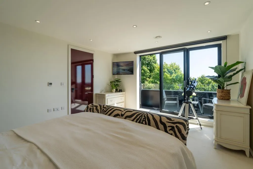 A fabulous master bedroom with the benefit of far-reaching views across Sheffield. Having recessed lighting, pendant light points, air distribution vent, TV/aerial point, data points and under floor heating. A door opens to the master en-suite. Bi-folding aluminium doors with double glazed panels open to the master balcony.