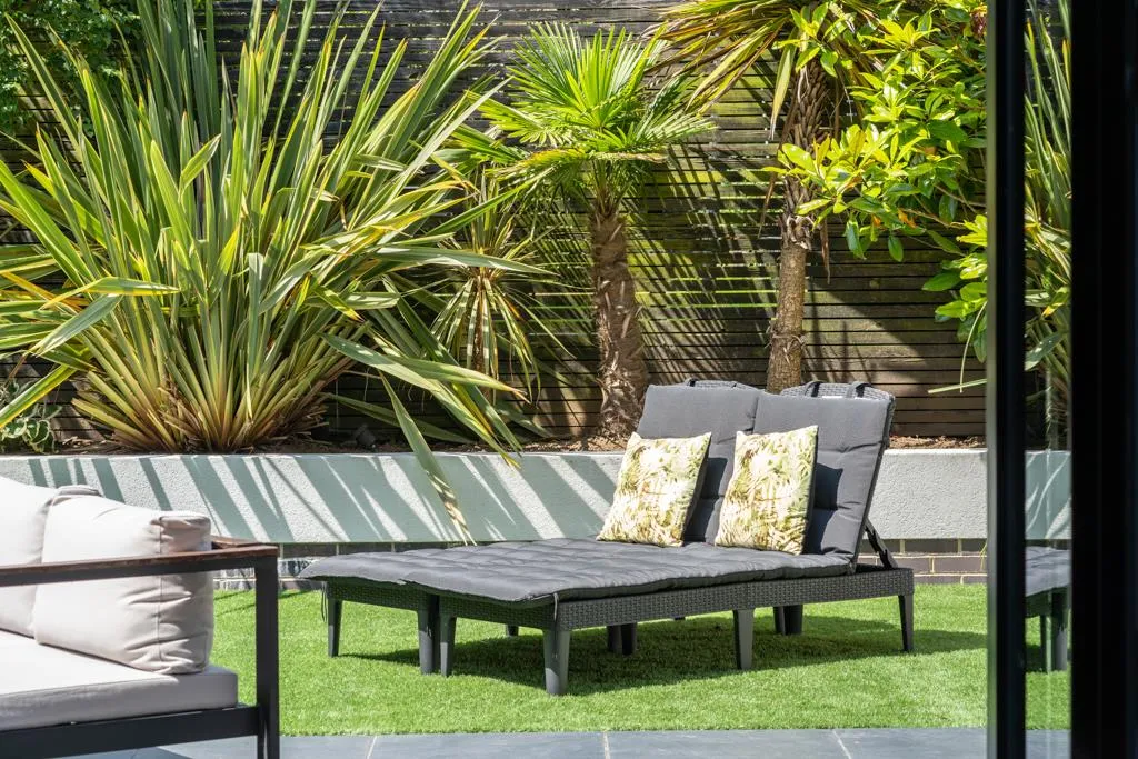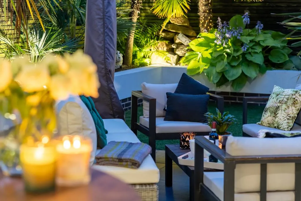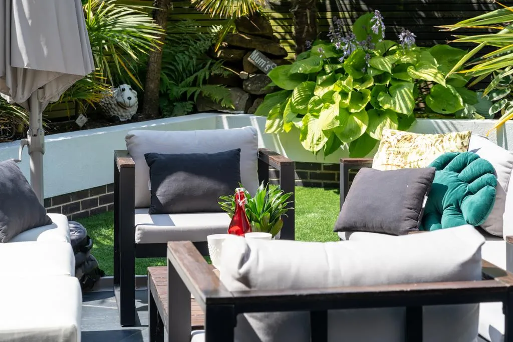 To the rear of the property, there is a slate flagged seating terrace with exterior lighting and access can be gained to the breakfast kitchen. There is also an area with artificial grass that is bordered by raised planters containing mature trees, shrubs and exterior lighting. Access can be gained to the left side of the property via steps, which lead down to a slate flagged path with exterior lighting, a water tap and is blocked off by a fence panel.