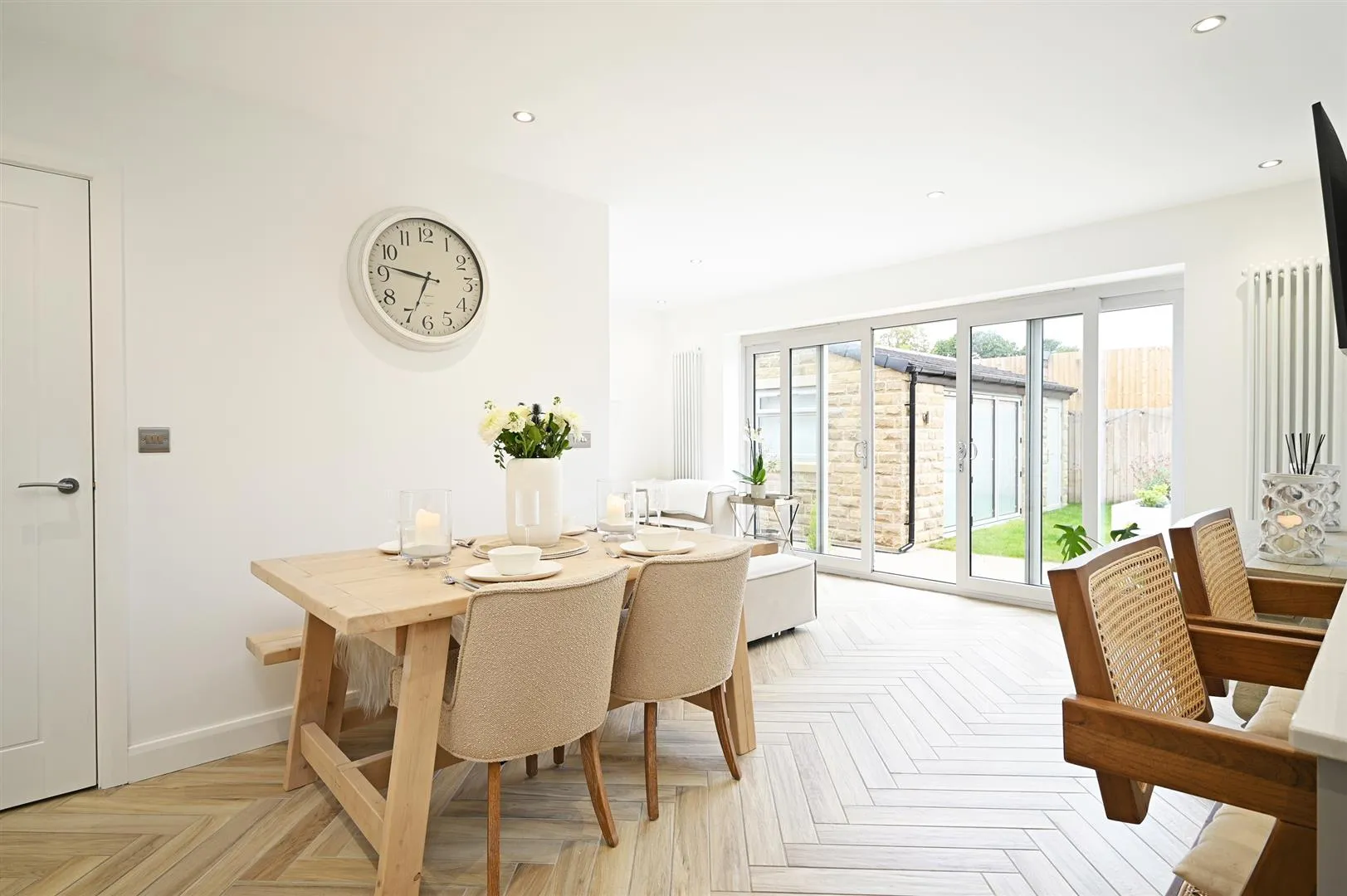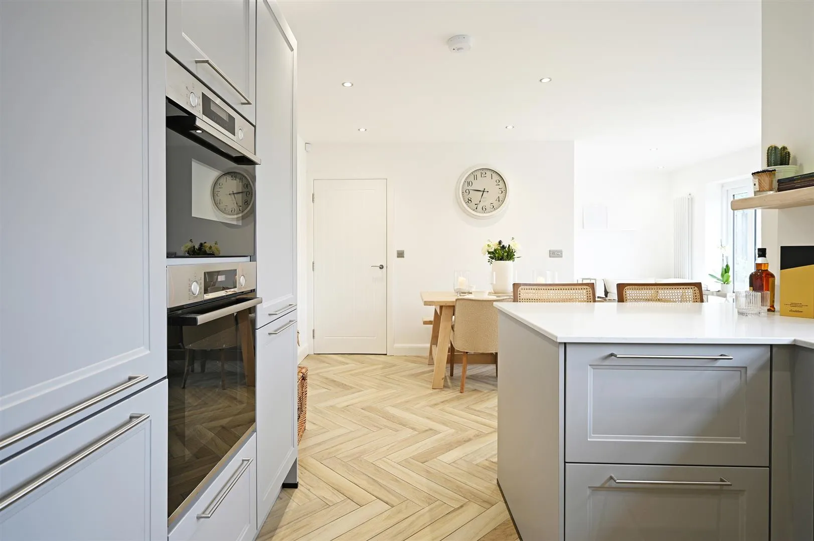 This beautiful residence presents bright accommodation that has been finished in a clean, neutral decor. The heart of the home is undoubtedly the open plan living kitchen, which incorporates wonderful areas for relaxing, dining and cooking. The dining kitchen features stylish quartz work surfaces, a breakfast bar and a range of integrated appliances. Sliding doors with glazing fill the room with natural light and allow a seamless connection to the low-maintenance rear garden. There is also a useful utility room, a WC and an under-stairs storage cupboard.
