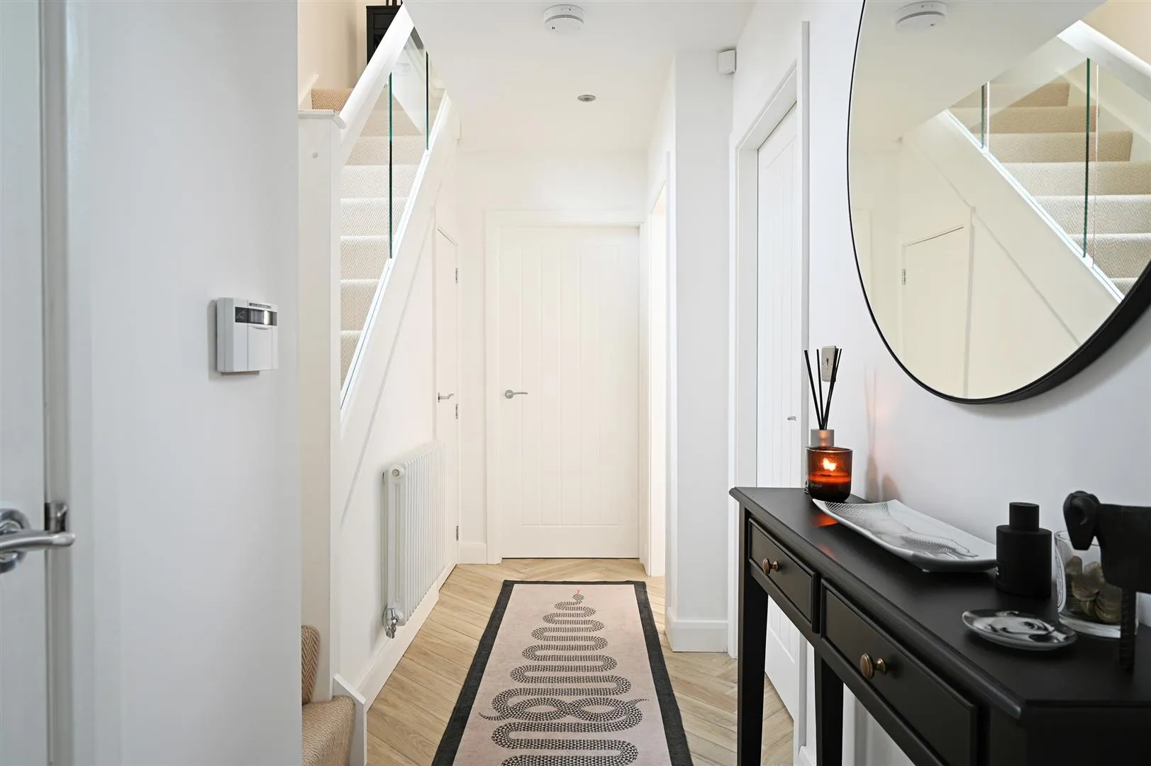 Having a side facing UPVC double glazed obscured panel, recessed lighting and a designer central heating radiator. Timber doors open to bedroom 3, the master bedroom, bedroom 2 and the family bathroom. Access can be gained to a loft space.