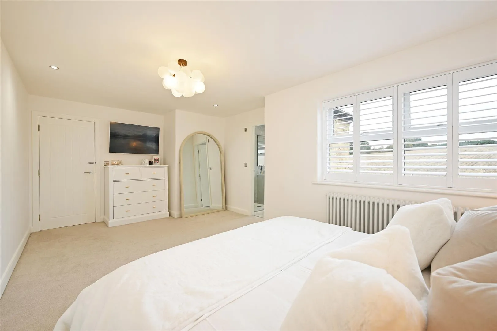 An exceptionally spacious and luxurious master bedroom suite with a rear facing UPVC double glazed window that has fitted shutters, pendant light points, recessed lighting, designer central heating radiator and a TV/aerial point. A timber door opens to the master en-suite shower room.