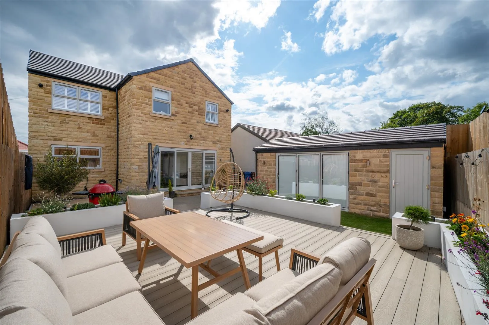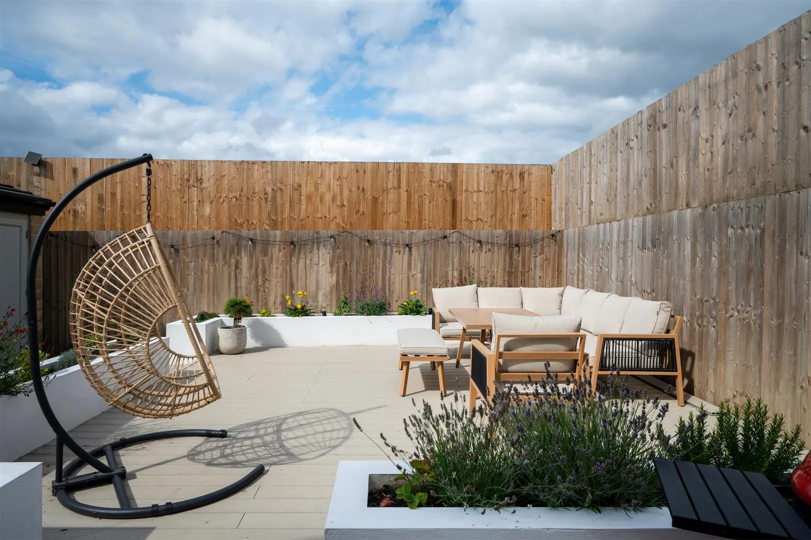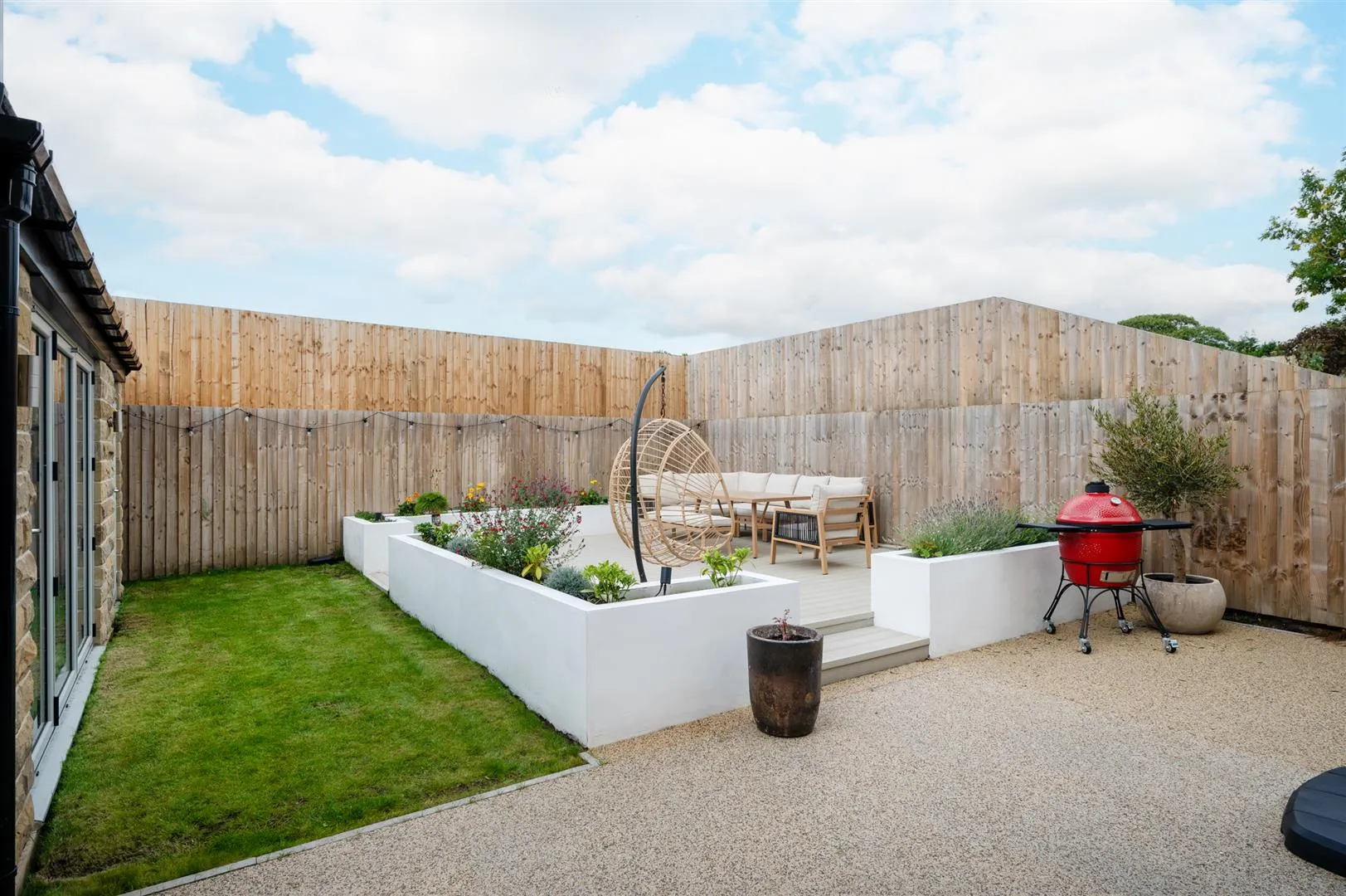 To the rear is a resin patio with exterior lighting, an external power point and a water tap. Access can be gained to the living kitchen. To one corner of the garden is a sizeable composite decked terrace with raised planters containing mature shrubs, flowers and exterior lighting. To the left of the terrace is a small lawned area, which provides access to the summer house and store. The garden is fully enclosed by timber fencing for privacy and security.