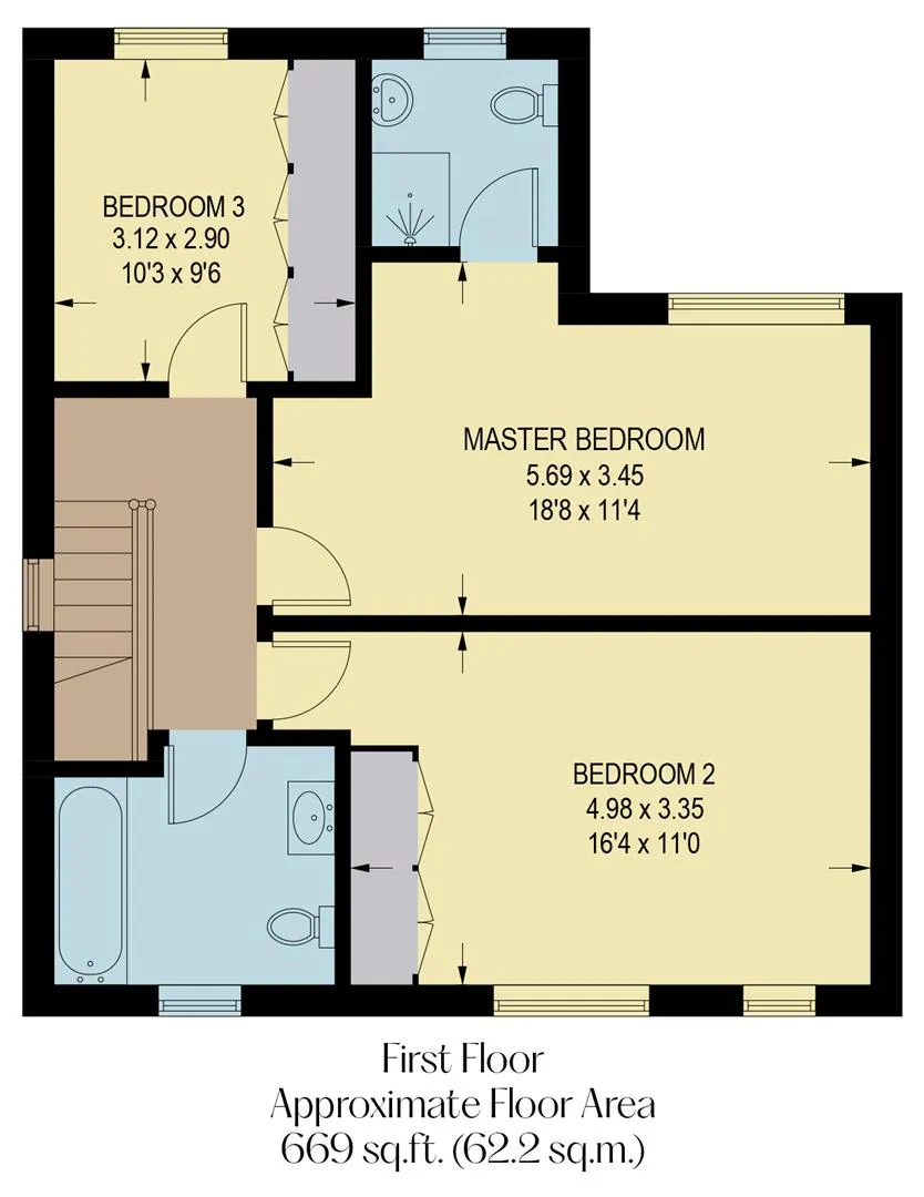 On the first floor: Landing, bedroom 3, master bedroom, master en-suite shower room, bedroom 2 and family bathroom.