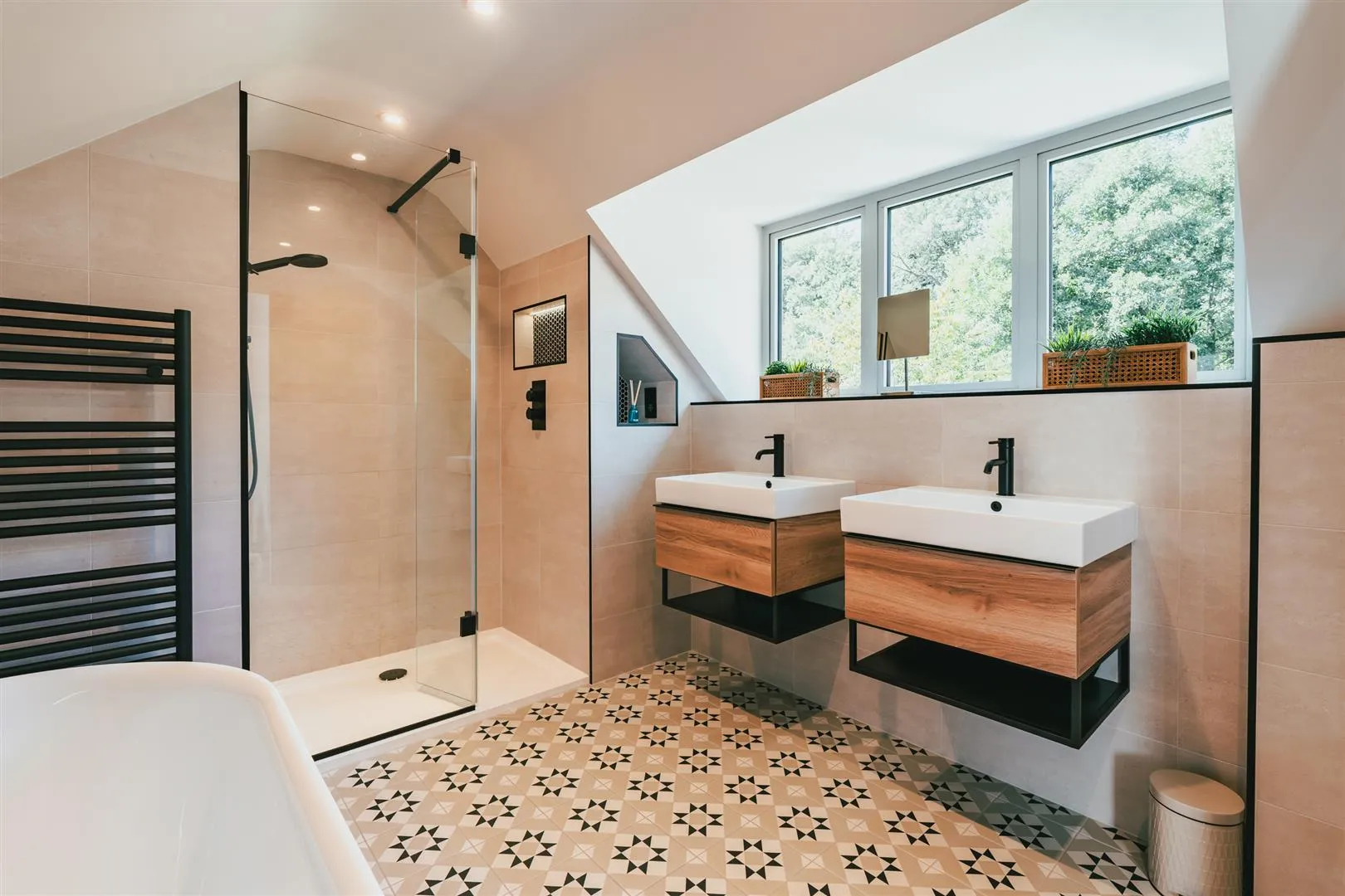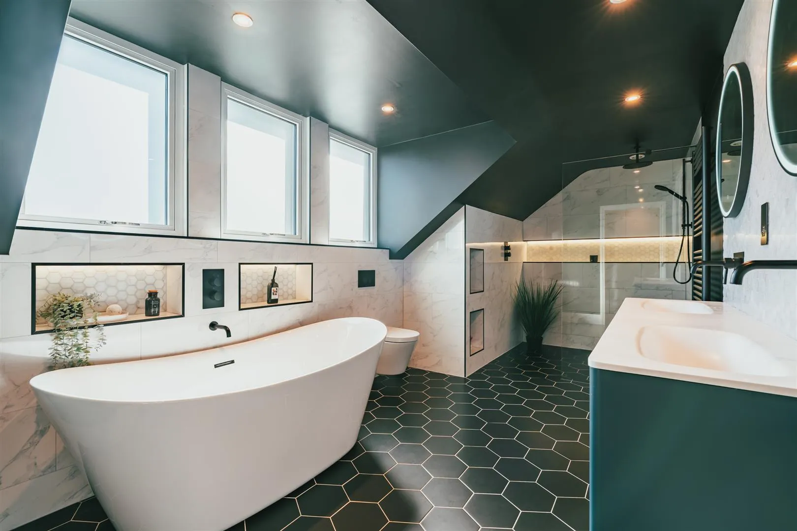 A lavishly appointed en-suite bathroom of sizeable proportions. Having front facing aluminium double glazed obscured windows, recessed lighting, extractor fan, partially tiled walls, heated towel rail, two illuminated vanity mirrors, shaver point and hexagonal tiled flooring. There are also four recessed tiled shelves, two of which have feature lighting. A suite in white comprises a wall mounted Imex WC and two wash hand basins with black mixer taps, storage beneath and a feature marble hexagonal tiled wall behind. Also having a freestanding bath with a black mixer tap. To one corner is a large walk-in shower enclosure with a fitted rain head shower, an additional hand shower facility, an illuminated recessed tiled shelf and a glazed screen.
