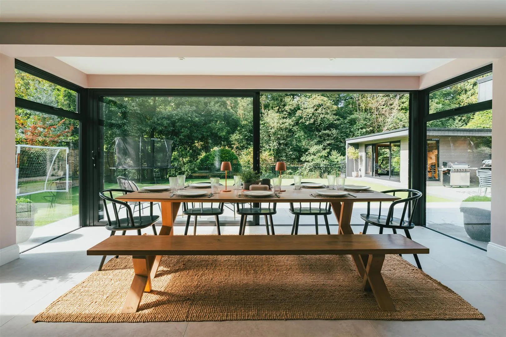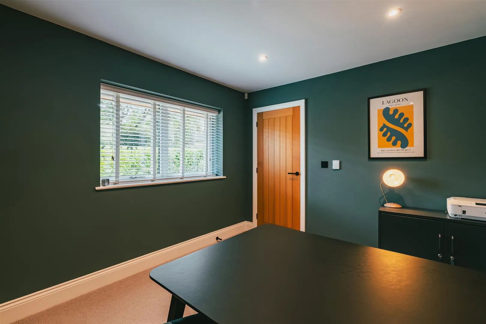 Stepping through the bespoke oak entrance door, an uninterrupted view through the dining kitchen, to the rear garden and beyond, provides an impressive welcome. Free-flowing, open plan spaces have been carefully considered to be functional and spacious, achieving a central place that all of the family can enjoy. The dining kitchen and adjacent sitting room are extremely well-proportioned and showcase two separate sets of sliding doors that connect to the landscaped, level rear garden. Within the high-quality kitchen are quartz work surfaces, Siemens integrated appliances and a central island with breakfast seating. Double Crittall-style doors open into the lounge; a calming retreat with a feature picture window. There is also a versatile office, downstairs WC and a laundry room.