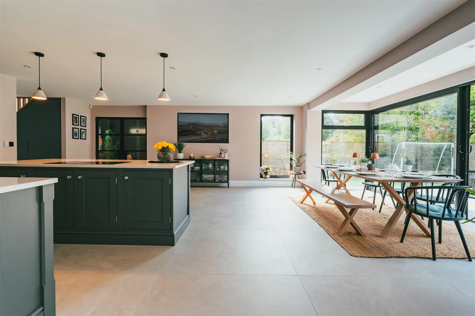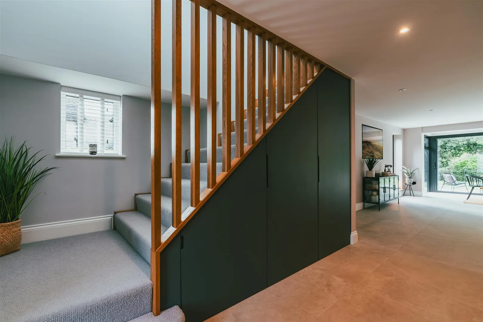 Impressively welcoming you into the home, the entrance hall has a side facing aluminium double glazed window, recessed lighting and tiled flooring with under floor heating. There is a range of useful under-stairs storage incorporating cloaks hanging and pull-out shoe racks. An oak door opens to the office and a wide opening leads into the dining kitchen.