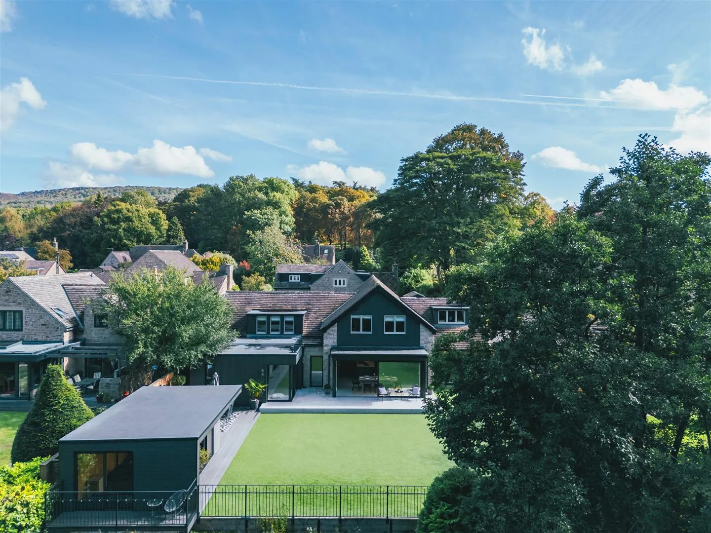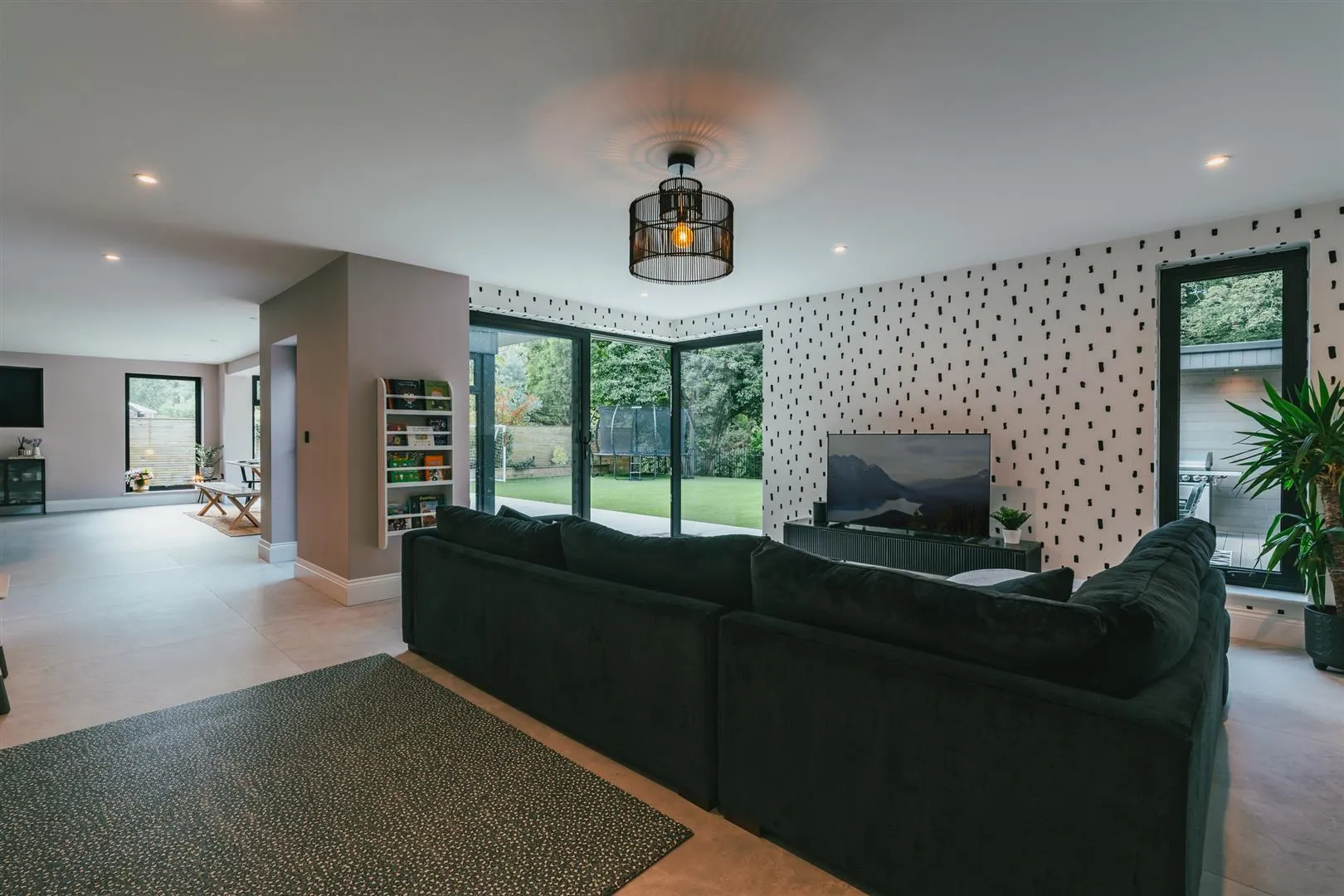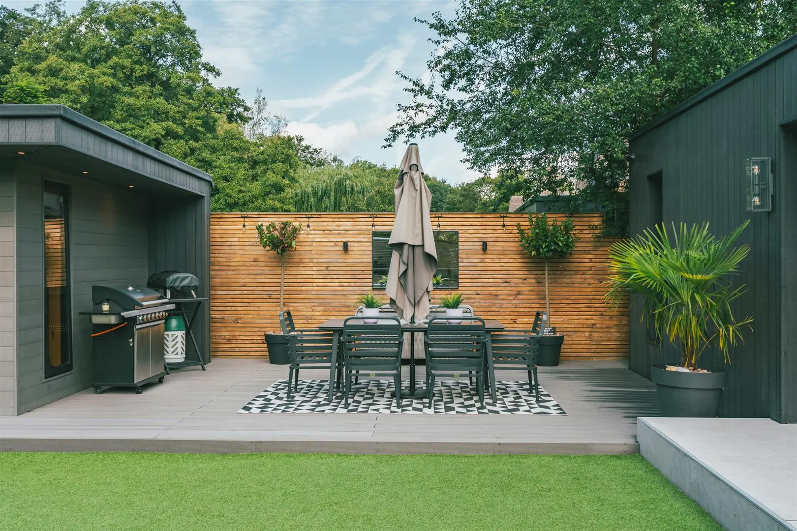 To the rear of the property, a low-maintenance, artificial lawn forms the garden and contains raised timber sleepers with mature trees and shrubs. Adjacent to the dining kitchen and sitting room is a porcelain flagged seating terrace with exterior lighting.