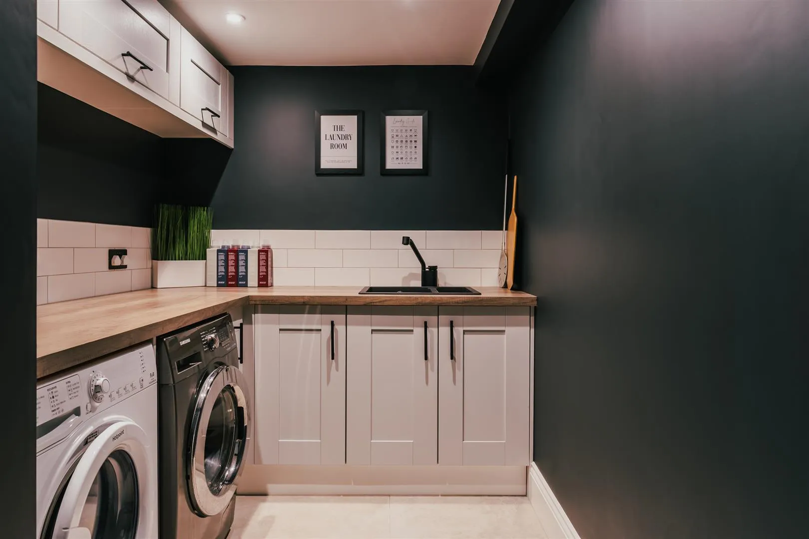 Having recessed lighting and tiled flooring with under floor heating. There is a range of fitted base and wall units, incorporating matching work surfaces, tiled splash backs and an inset 1.5 bowl sink with a black mixer tap. Space/provision is provided beneath the work surface for a washing machine and a tumble dryer.
