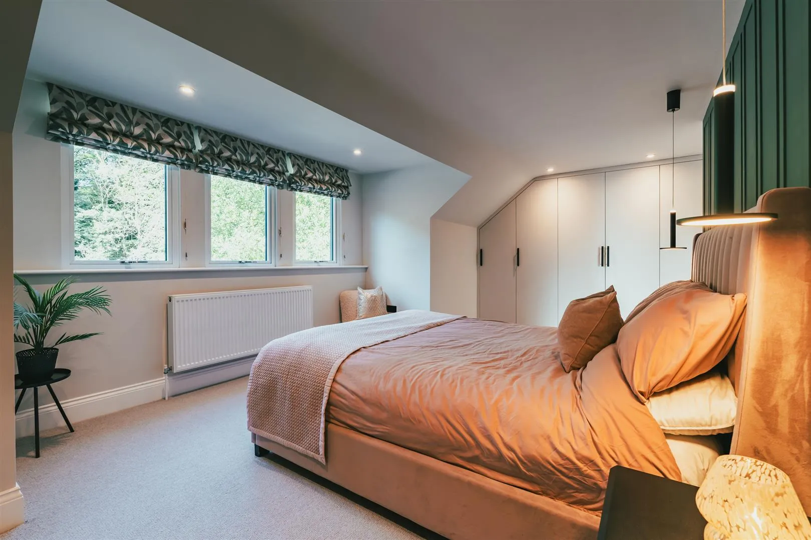 Another well-proportioned bedroom with a rear facing aluminium double glazed window, recessed lighting and a central heating radiator. There is a range of fitted furniture, incorporating short hanging, drawers and shelving.