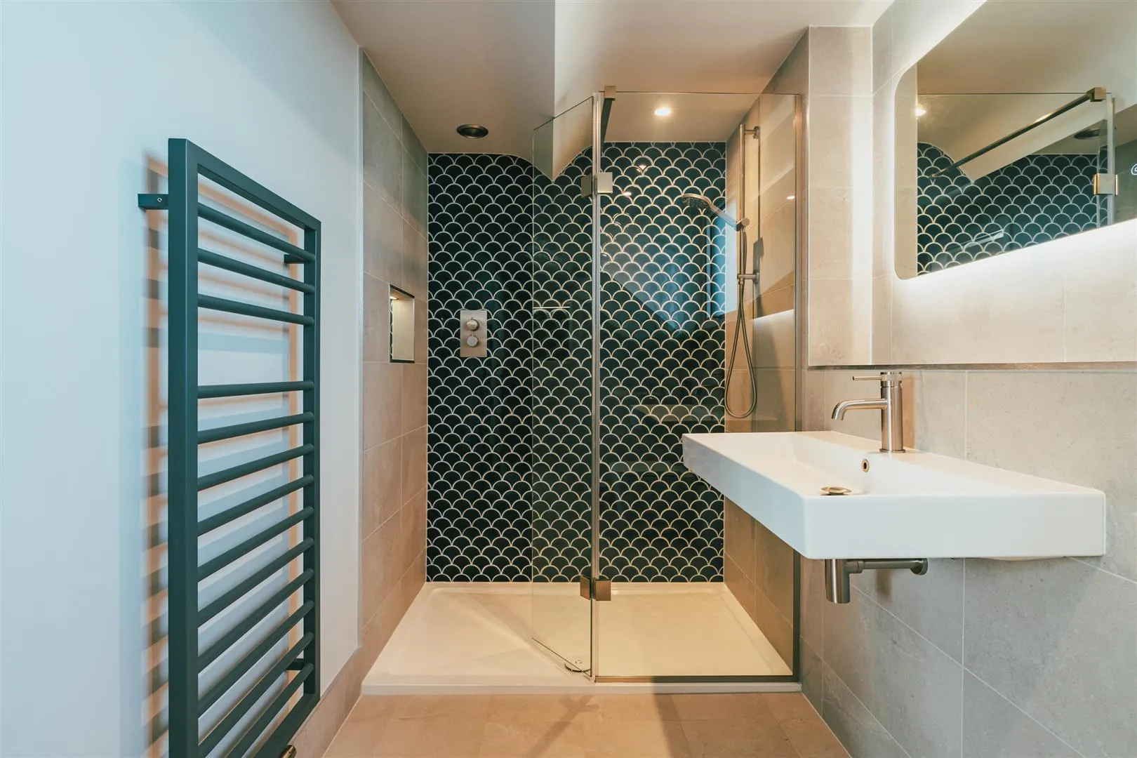 Having a side facing aluminium double glazed obscured window, recessed lighting, extractor fan, partially tiled walls, illuminated vanity mirror, heated towel rail, shaver point and tiled flooring. There is a suite in white, which comprises a wall mounted Imex WC and a wall mounted wash hand basin with a brushed chrome mixer tap. To one wall is a shower enclosure with a fitted shower, an illuminated recessed tiled shelf and a glazed screen/door.