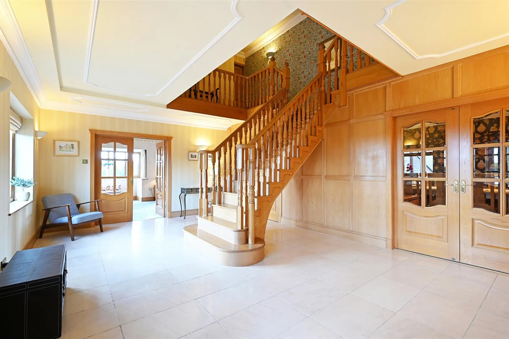 Having front and rear facing UPVC double glazed windows, recessed lighting and limestone tiled flooring with under floor heating and an inset mat well. Double oak doors with glazed panels open to the reception hall.