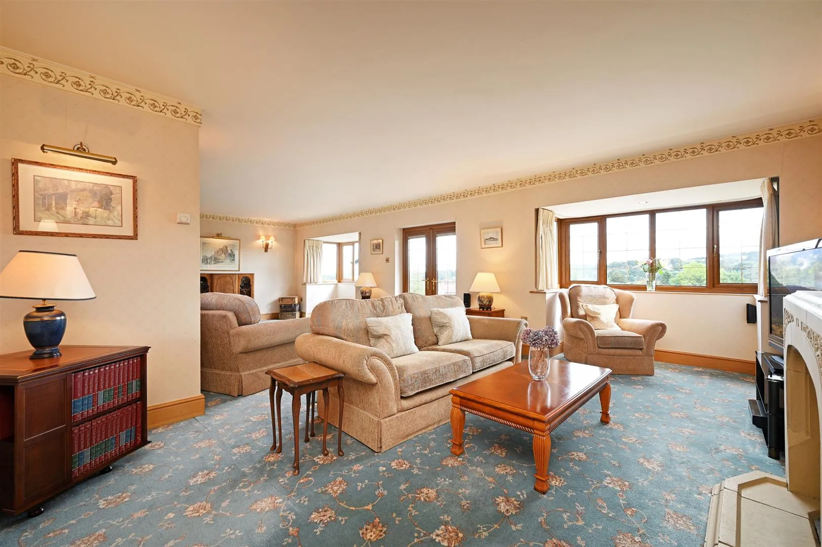 From the reception hall, a grand oak staircase with hand rails and balustrading rises to the: