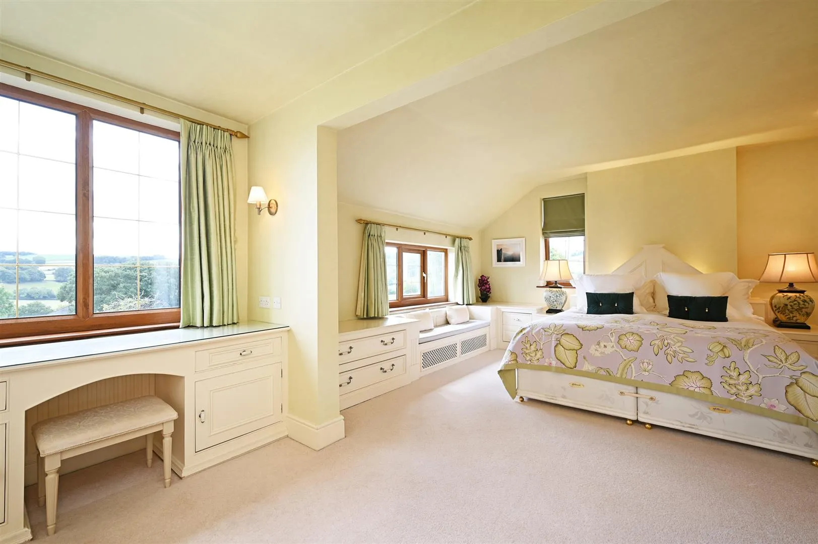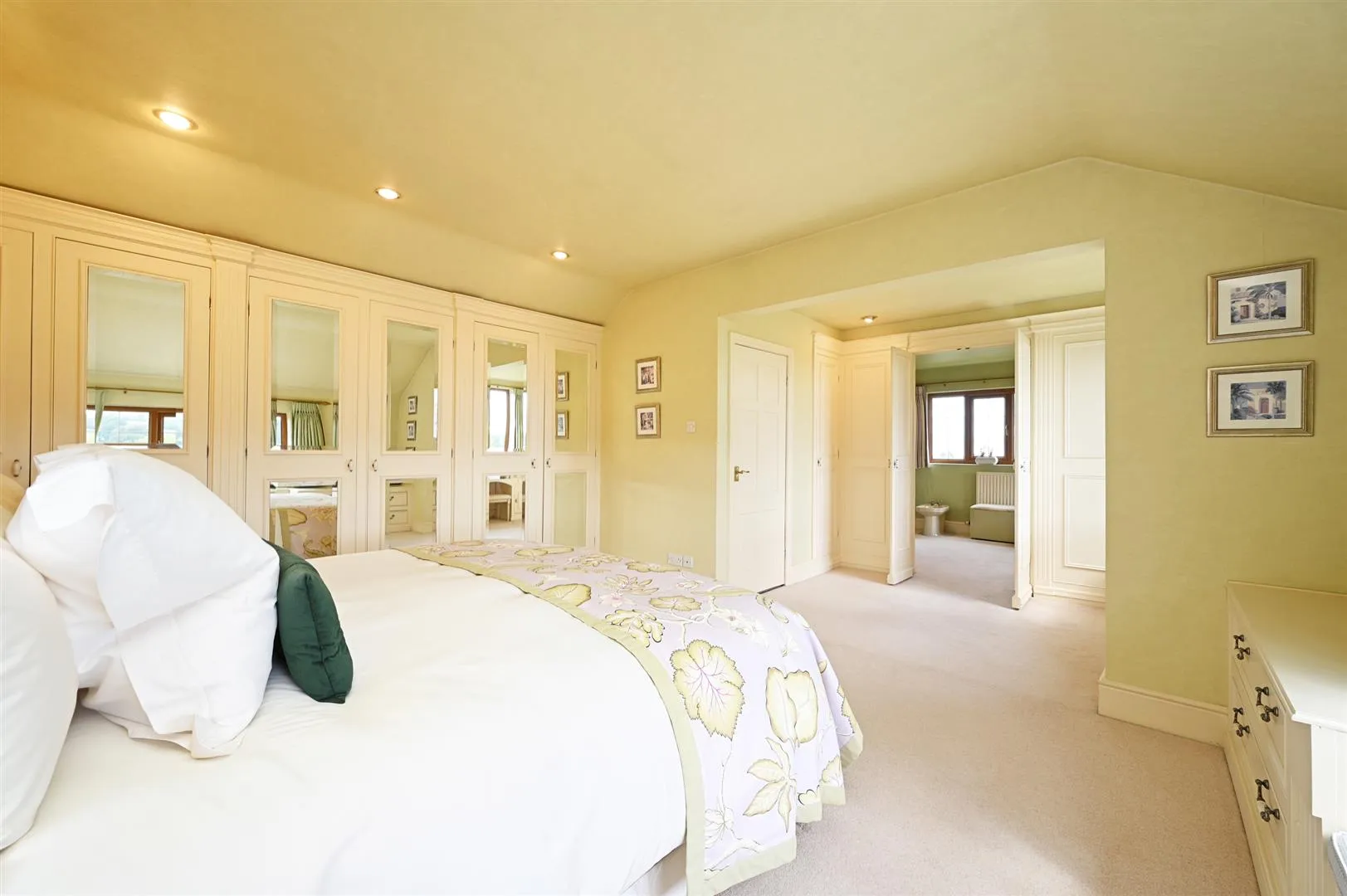An impressively large master bedroom suite with two front facing UPVC double glazed windows that take full advantage of the far-reaching countryside views. Also having a side facing UPVC double glazed panel, recessed lighting, wall mounted light points, central heating radiators and a TV/aerial point. There is a range of fitted furniture, incorporating short/long hanging, shelving, drawers, a window seat and a vanity table. Double timber doors open to the master en-suite bathroom.