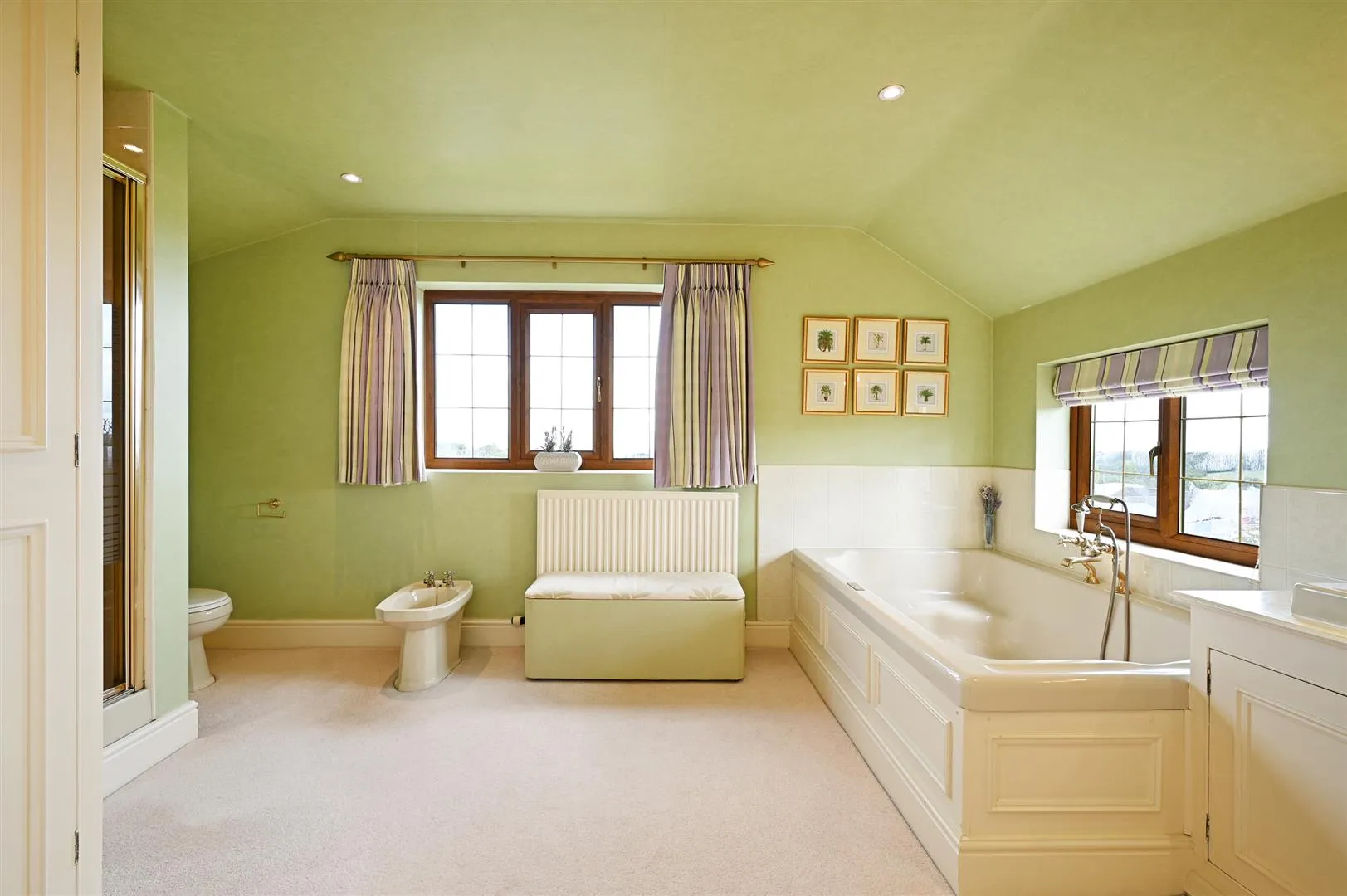 A large en-suite bathroom with front and side facing UPVC double glazed windows, recessed lighting, wall mounted light point, two partially tiled walls and a central heating radiator. There is a range of fitted furniture incorporating long hanging and shelving. A suite comprises a low-level WC, a bidet with traditional taps and an Armitage Shanks wash hand basin with a mixer tap and storage beneath. Also having a jacuzzi bath with a mixer tap and a hand shower facility. To one corner is a shower enclosure with a fitted shower and a glazed screen/door.
