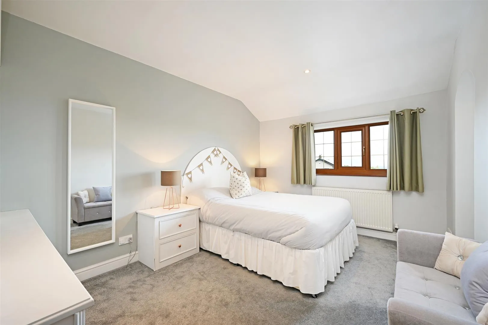 A bright and spacious double bedroom suite with a side facing UPVC double glazed window, recessed lighting, central heating radiator and a TV/aerial point. There is a range of fitted furniture, incorporating shelving and drawers. An arched opening gives access to the dressing room.
