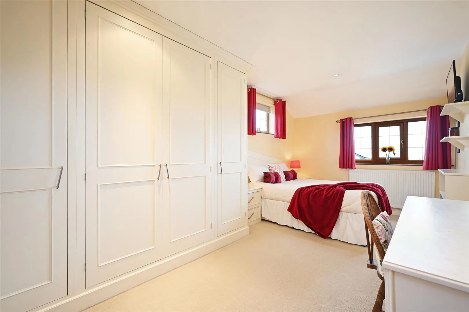 Another double bedroom suite with side and rear facing UPVC double glazed windows, recessed lighting, central heating radiator, telephone point and a TV/aerial point. There is a range of fitted furniture, incorporating short/long hanging, shelving and a vanity table with drawers and a mirror. A timber door opens to the bedroom 3 en-suite shower room. Access can also be gained to a loft space.