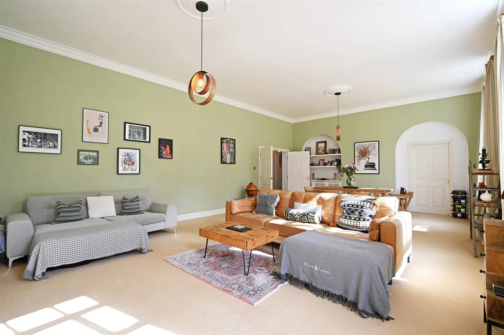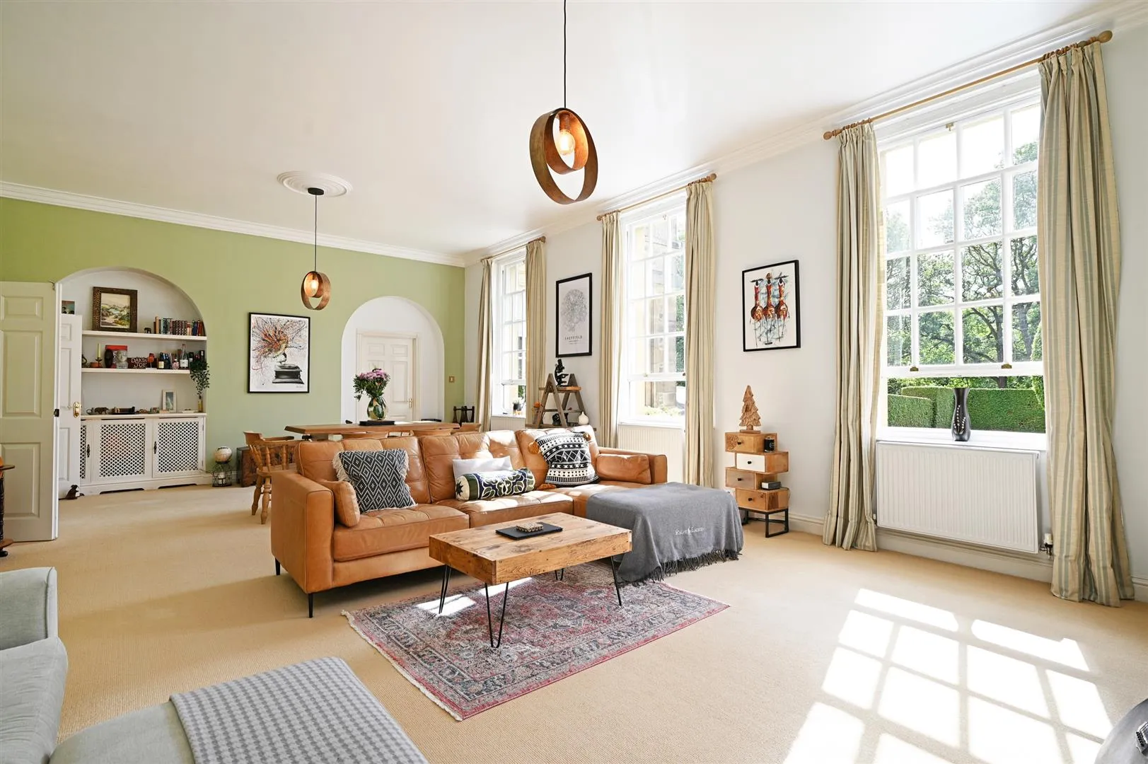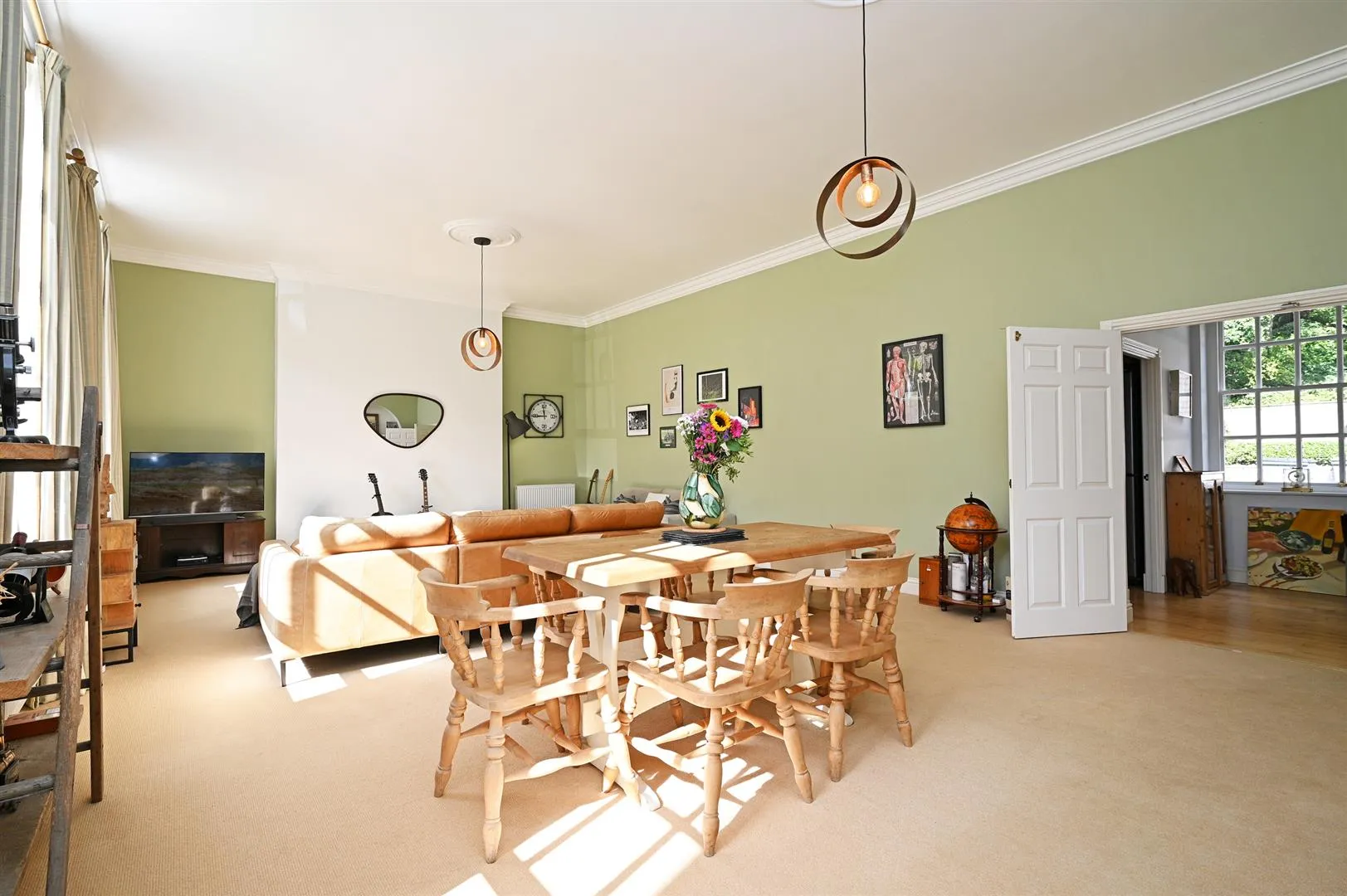 A stunning reception room of sizeable proportions featuring a high, coved ceiling and front facing timber glazed sash windows. Also having pendant light points with decorative ceiling roses, central heating radiators and a TV/aerial point. There is a range of fitted furniture, incorporating shelving and cupboards with a telephone point. A timber door opens to the hall.