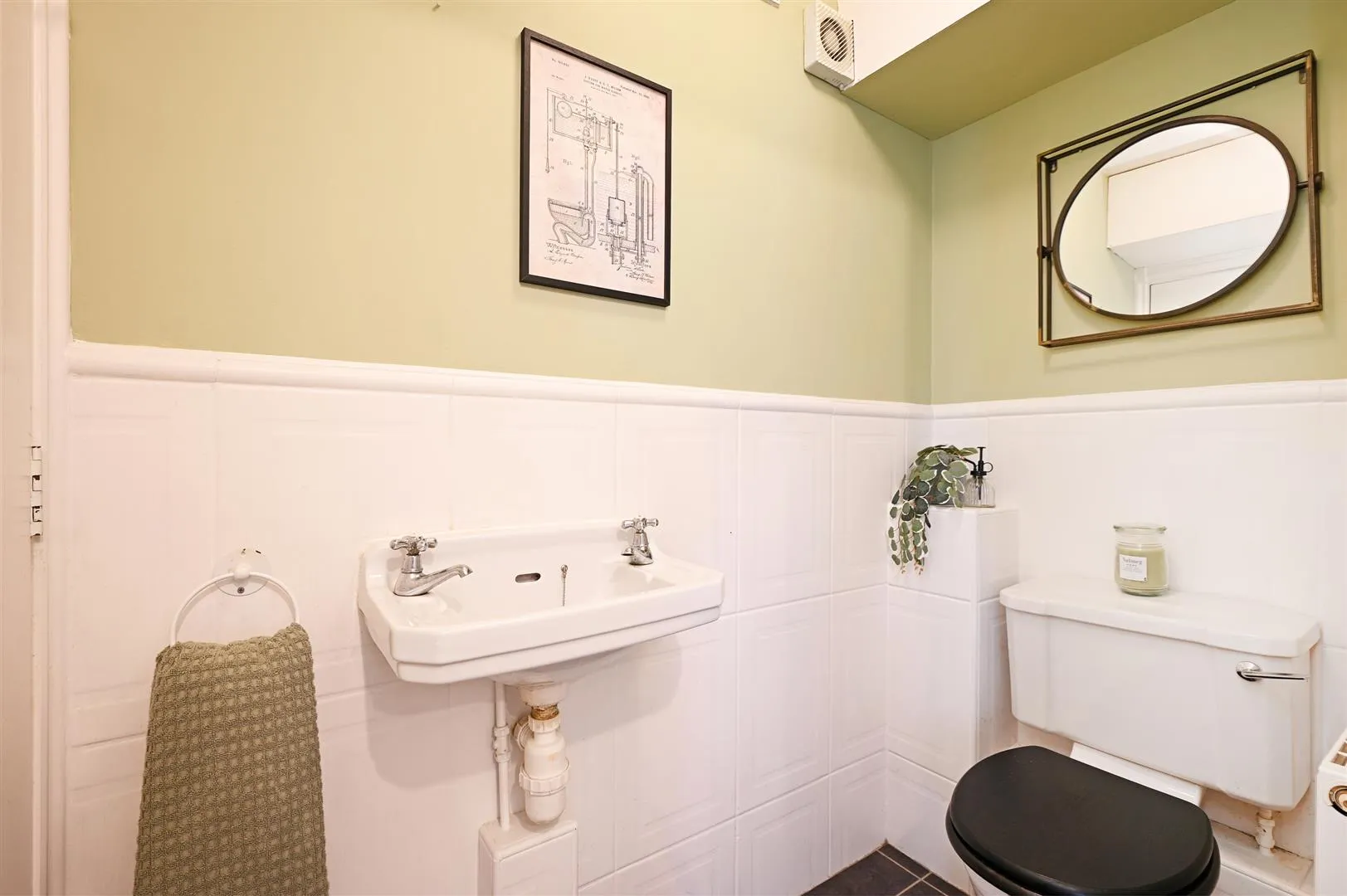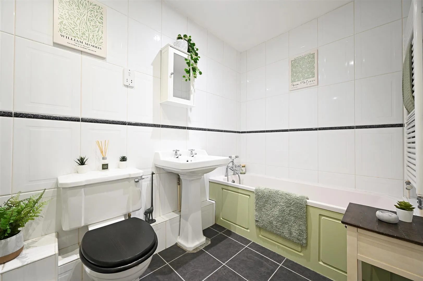 Having a flush light point, extractor fan, partially tiled walls, central heating radiator and tiled flooring. There is a suite in white, which comprises a low-level WC and a wash hand basin with traditional chrome taps. A timber door opens to the boiler cupboard.