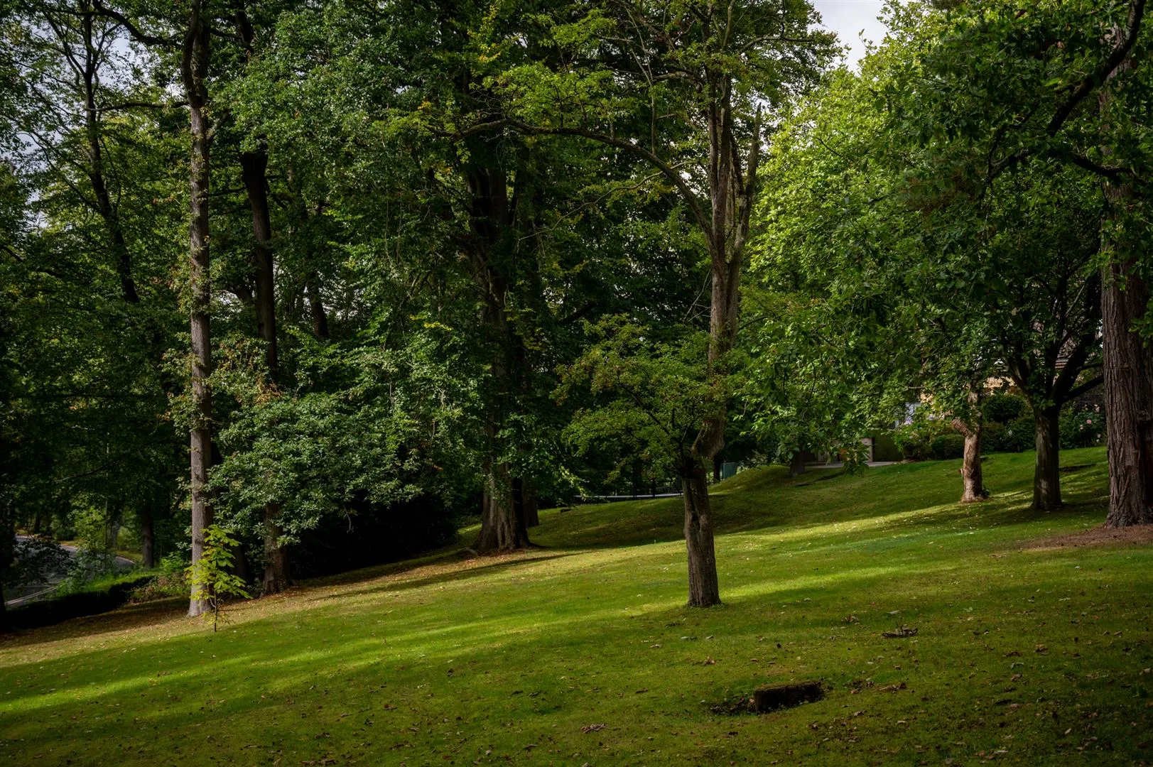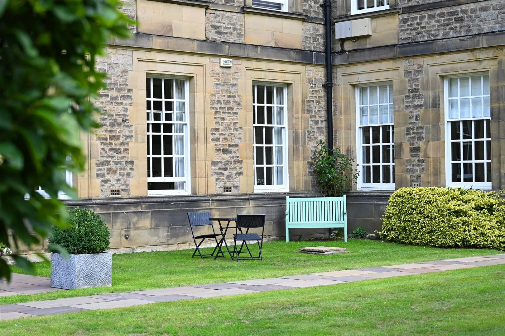 A stone flagged path leads from the front of the building to the communal gardens in front of Apartment 19, which are mainly laid to lawn and have mature trees.