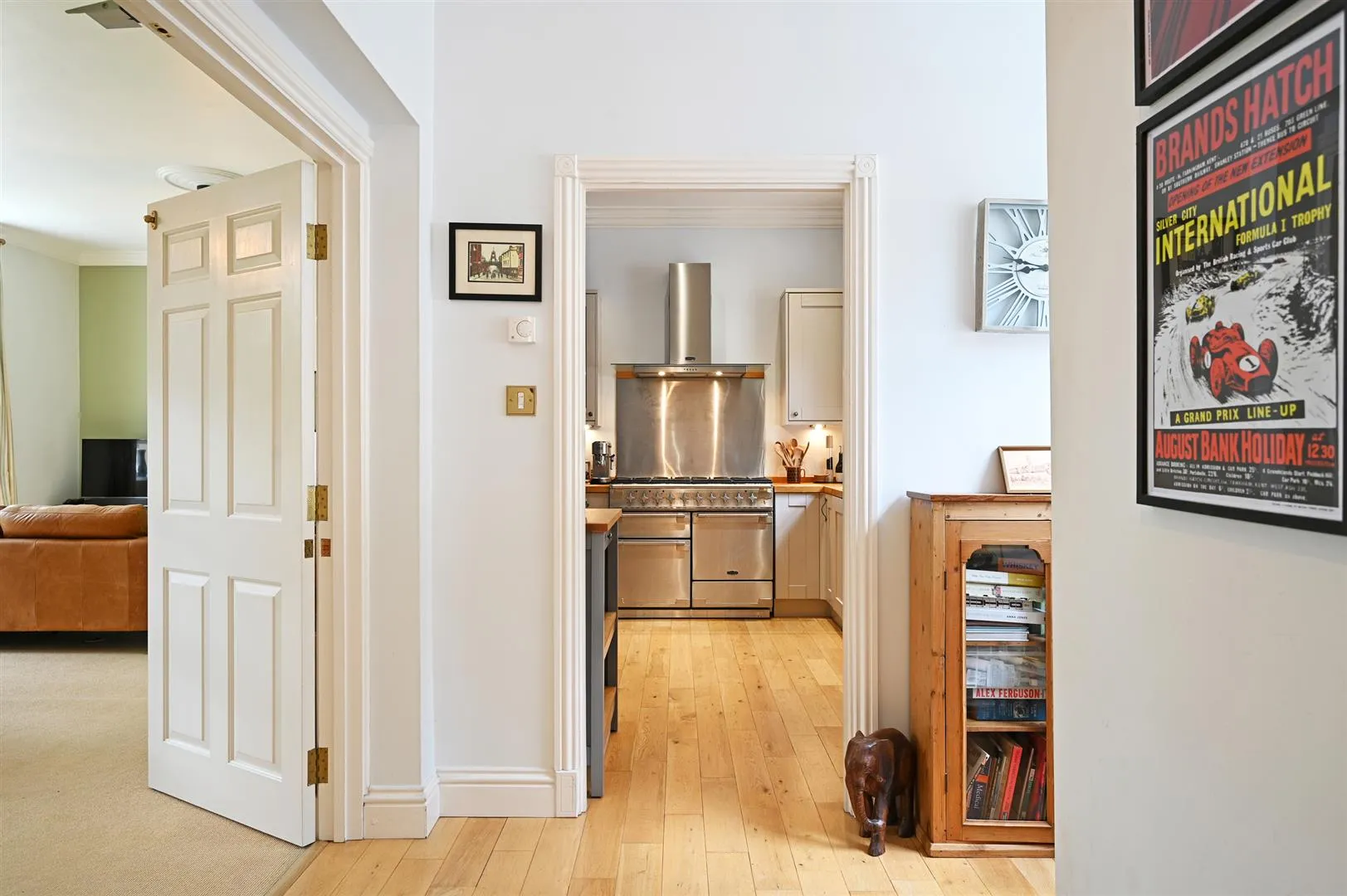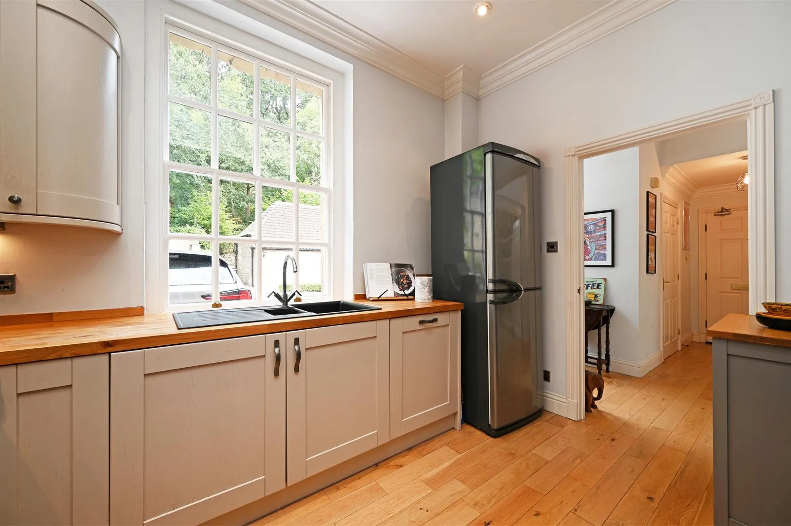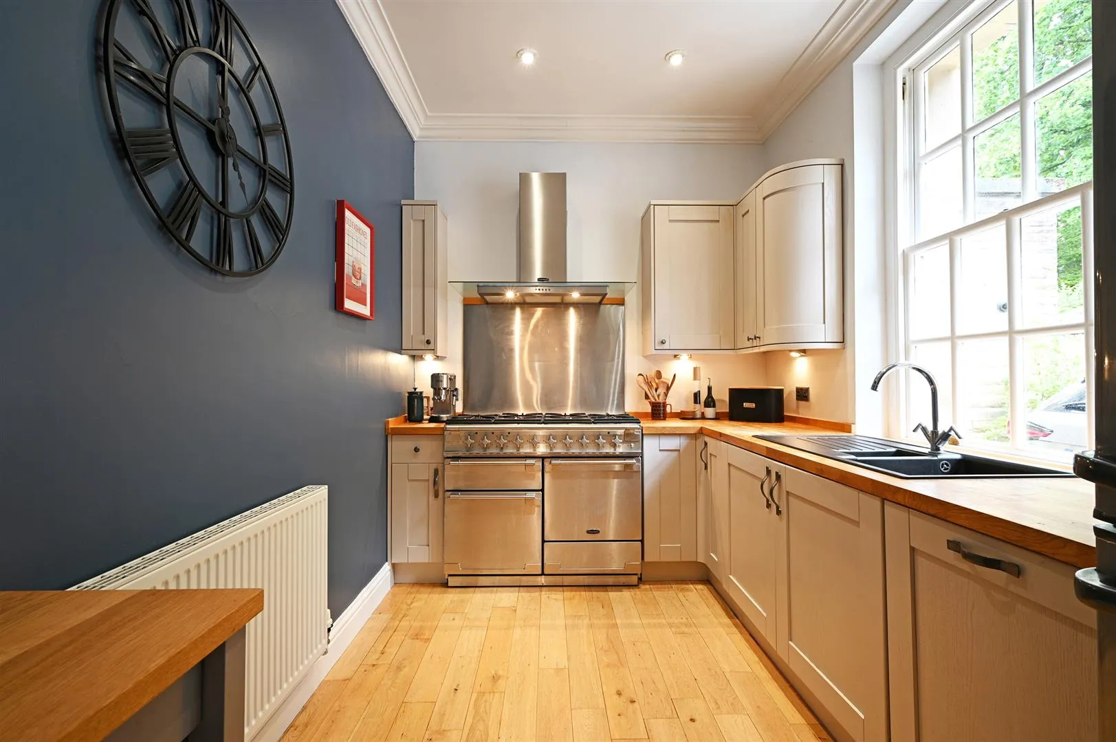 A superb kitchen with a rear facing timber glazed sash window, coved ceiling, recessed lighting, central heating radiator and oak flooring. There is a range of fitted base/wall and drawer units, incorporating oak work surfaces, upstands, under-counter lighting and an inset 1.5 bowl sink with a chrome mixer tap. The integrated appliances include an Electrolux dishwasher and a Beko washing machine. There is a Rangemaster range cooker with a six-ring gas hob, two ovens, a grill, a storage drawer and a Rangemaster extractor hood above. There is space/provision for a freestanding fridge/freezer.