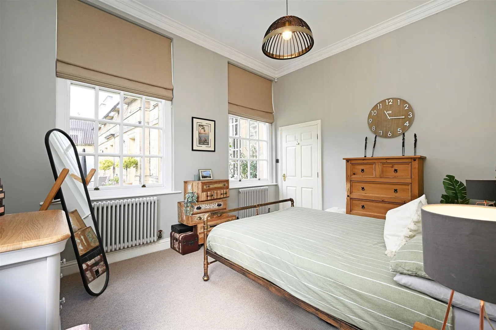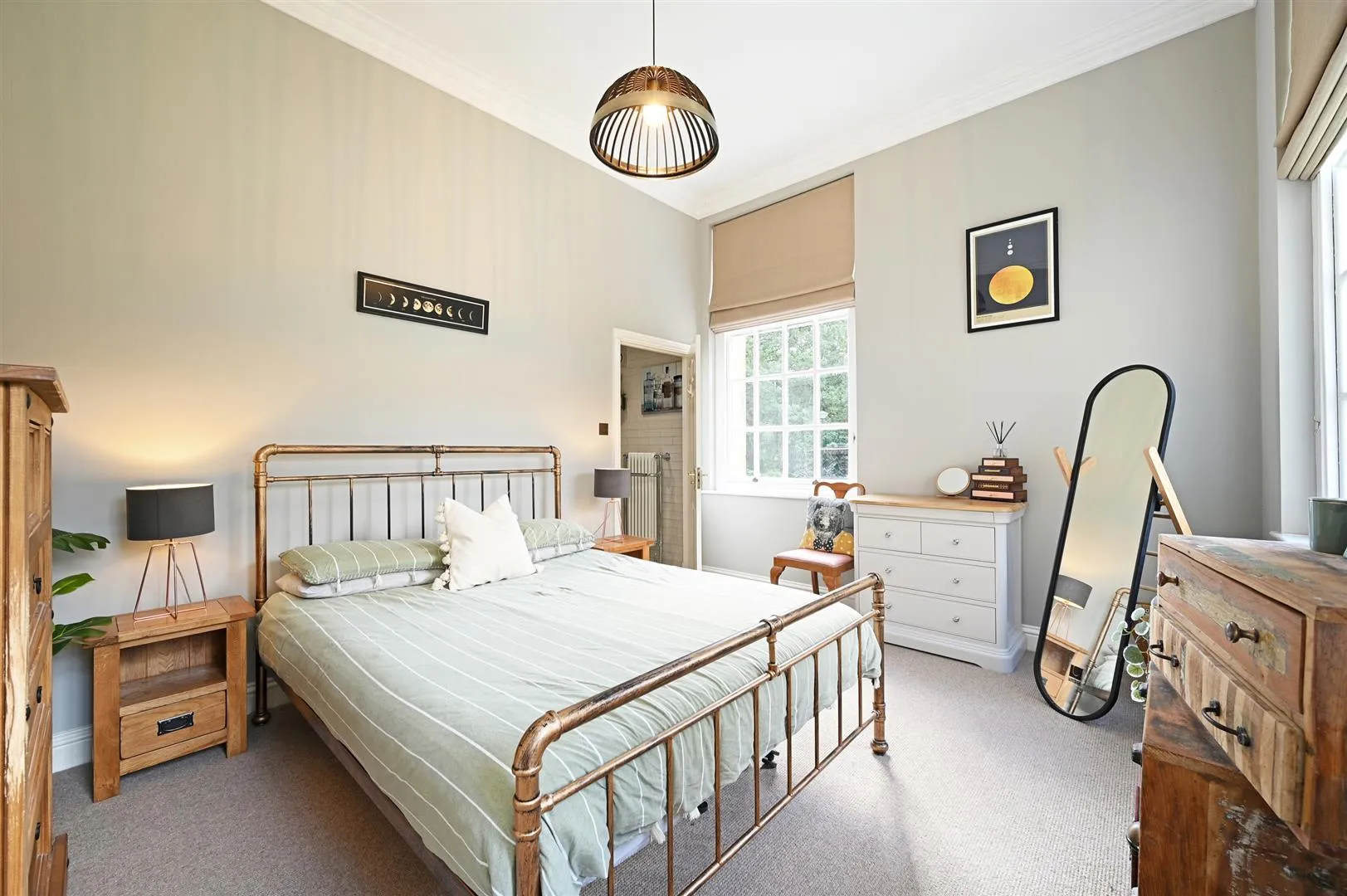 A spacious double bedroom suite with front and side facing timber glazed sash windows, coved ceiling, pendant light point, central heating radiators, telephone point and a TV/aerial point. A timber door opens to the master en-suite shower room.