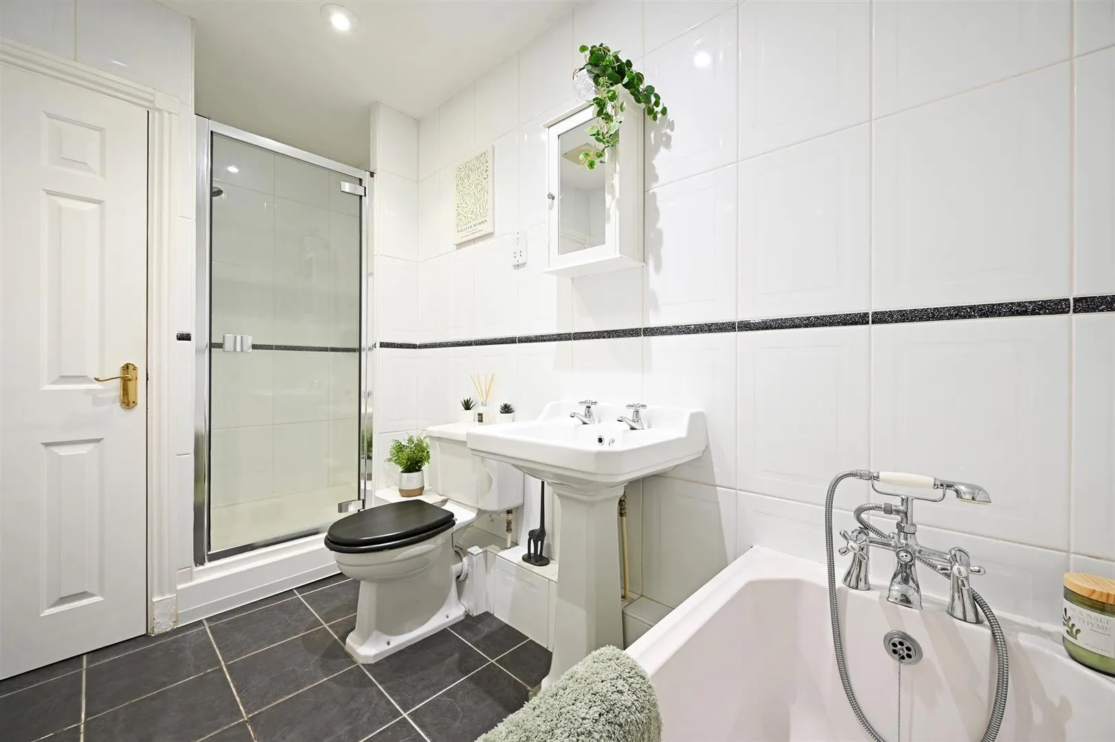Being fully tiled and having recessed lighting, extractor fan, heated towel rail and a shaver point. A suite in white comprises a low-level WC and a pedestal wash hand basin with traditional chrome taps. Also having a panelled bath with a chrome mixer tap and a hand shower facility. To one corner is a shower enclosure with a fitted Aqualisa shower and a glazed screen/door. A timber door opens to the linen cupboard.