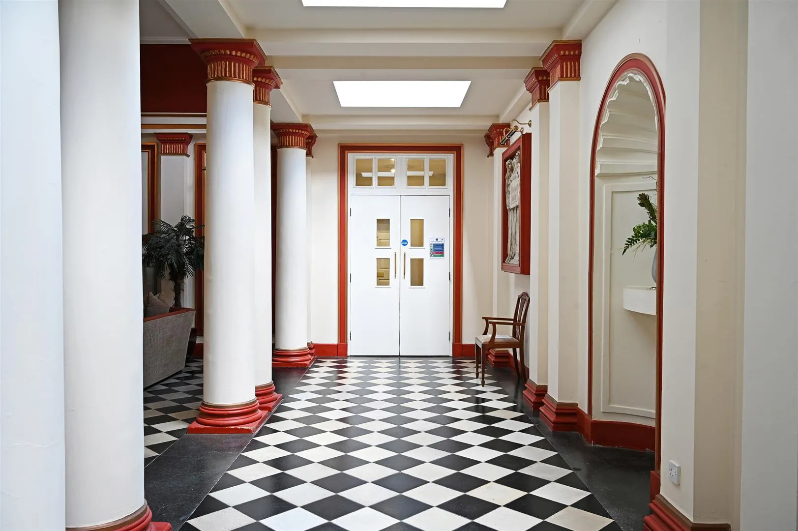 From the front of the building, grand, Georgian-style double doors with intercom entry open to the: