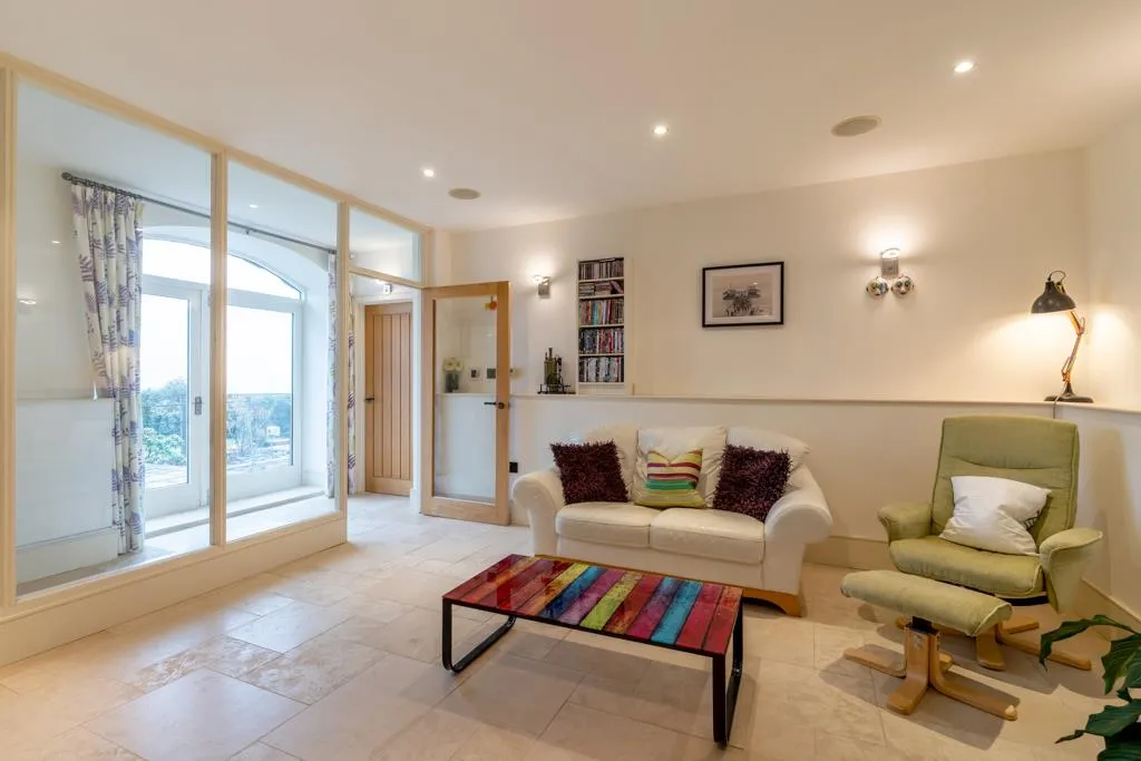 The focal point of the room is the floor-to-ceiling glazed panels that overlook the inner hallway and beyond to the far-reaching views. There is also a side facing glazed panel, recessed lighting, built-in ceiling speakers, wall mounted light points, a data point and limestone tiled flooring with under floor heating.