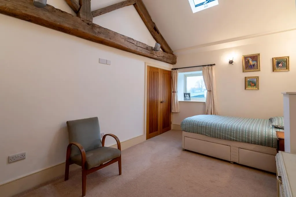 Having a rear facing double glazed window, and a vaulted ceiling with exposed timber beams and an aluminium double glazed roof window with a fitted blind. There is also wall mounted light points, speakers and under floor heating. Double oak doors open to a wardrobe with a long hanging rail and shelving.